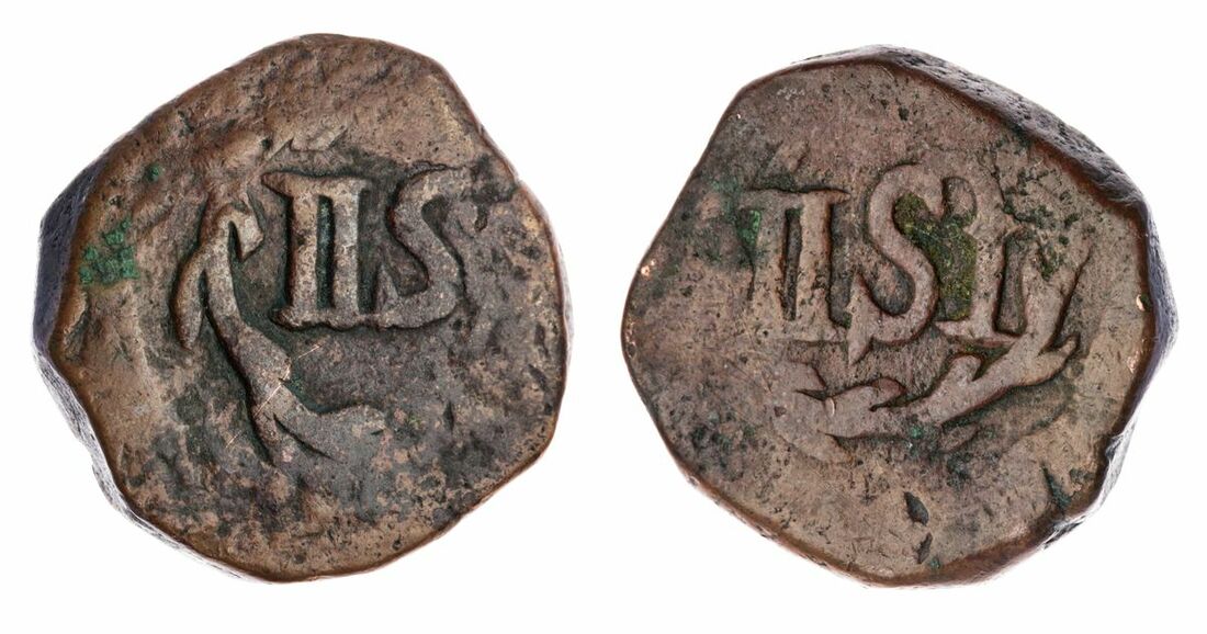 (x) Sri Lanka (Ceylon), Dutch Colony (VOC), AE 2-Stuivers, 31.22g, wreath type, undated (1660-1720), type Aa, leaves of wreath rotate to left (Scholten 1289; KM 20), both sides a little off centre, good fine
