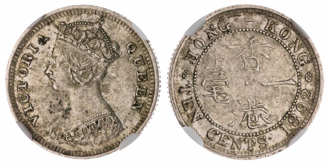 (x) NGC AU58 | British Administration, Hong Kong, Victoria (1837-1901), 10-Cents, 1892 (KM 6.3), uneven toning, very fine, in NGC holder, graded AU58 (Cert. #6769445-030)