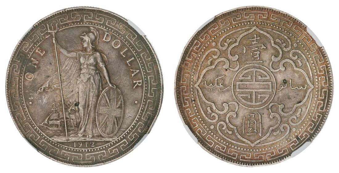 NGC AU58 | British Administration, Hong Kong, George V (1910-1936), Trade Dollar, 1912 B, Britannia standing left, rev. ornate cartouche with value in Chinese and Malay (KM T5; Pr. 22), toned, about extremely fine, in NGC holder graded AU58 (Cert. 6769445-024)