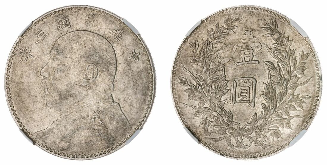 (x) NGC AU58 | China, Republic, 'Fatman' Dollar, Year 3 (1914), Yuan Shih Kai, milled edge, 26.3g (KM Y# 329), weakly struck, yet with a residual lustre, pleasing very fine, in NGC holder, graded AU58 (Cert. #6769445-020)