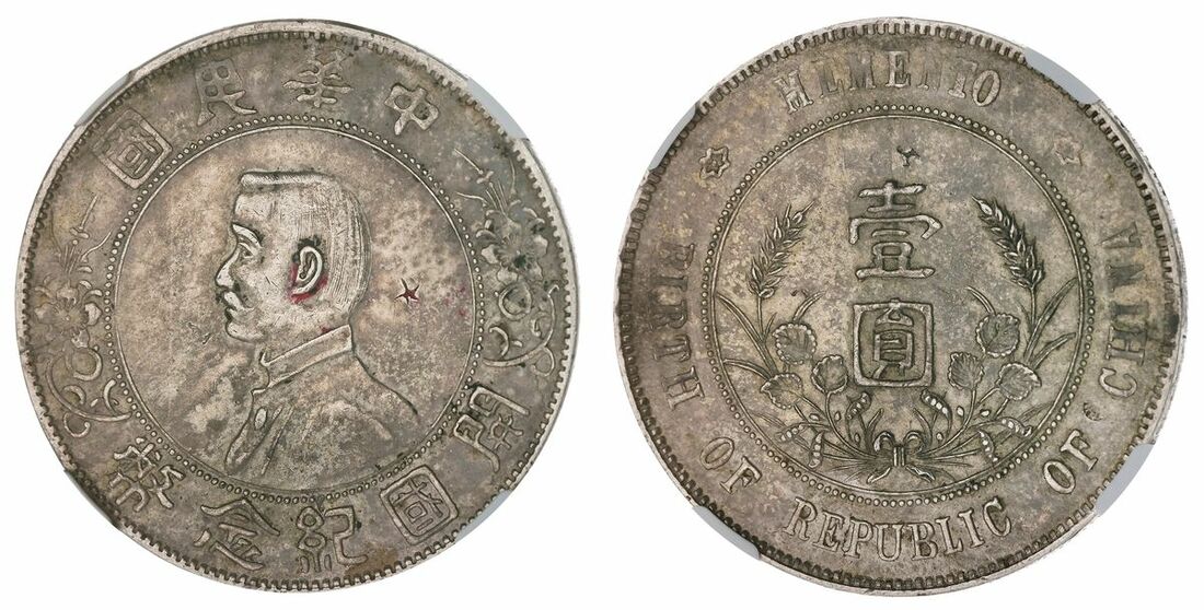 (x) NGC AU DETAILS | China, Republic, Memento Dollar, undated (1927), bust of Sun Yat Sen left, milled edge, 26.72g (KM Y.318a.1), stained and tooled in the obverse field, otherwise bolder very fine, in NGC holder, graded AU DETAILS, chopmarked (Cert. #6769445-023)