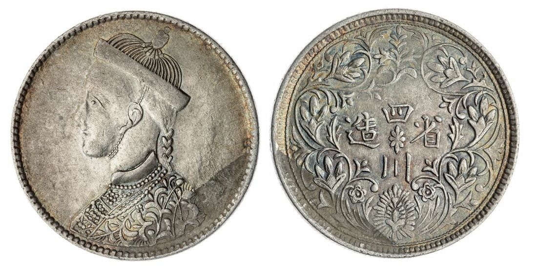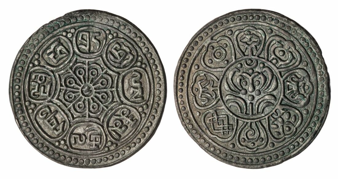 (x) Tibetan Government, Anonymous (c.1907-22, 1924-5), Tangka, Dode Mint, undated, F group (KM F.13.1), some verdigris to recesses, otherwise extremely fine; Tibet (1911-33), Sichuan Rupee, Chengdu mint, undated, small head of the Chinese emperor Guang Xu with collar, rev. vertical rosette with legend si chuan sheng zao, within wreath derived from those found on Indian Rupees, without leaf in north-east position, milled edge, 6h, 11.42g (LM 359), toned, pleasing very fine (2)