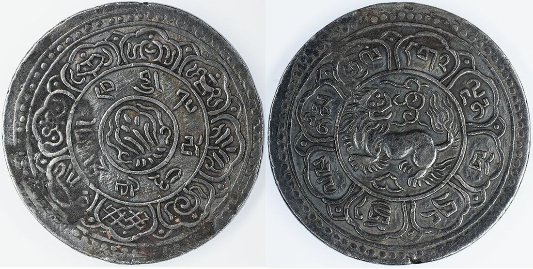 (x) Tibet, time of 13th Dalai Lama, Anonymous (1909), 1-Tam Srang, 18.53g, 15-43, snow lion looking back, ornaments above lion's back, within circle to which eight lotus petals are attached, each containing one syllable of the legend dga ldan pho brang phyo(gs) las rnam rgyal ("the Ganden Palace, victorious in all directions"), rev. triratna (triple gem) in centre surrounded by circle around which the following legend is found (starting at 12 o'clock and reading clockwise): rab byung 15 lo 43 tam srang gang ("cycle 15, year 43, one tam srang"), this surrounded by a circle to which eight lotus petals are attached, each containing one of the eight Buddhist auspicious emblems, vertical stroke in north symbol (YZM 390 var; KM. Y#12 var; LM 656), with traces of mount on obverse, good very fine, rare, not suitable for NGC certification (Cert. #6767640-010)