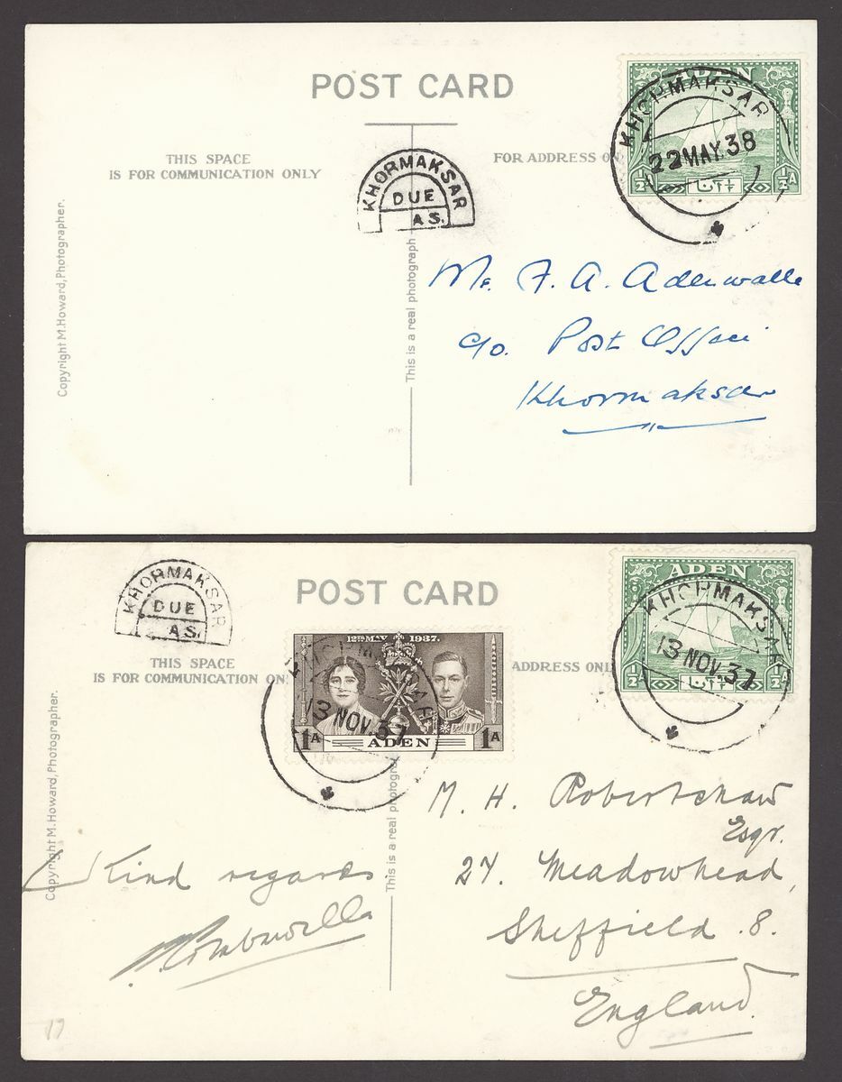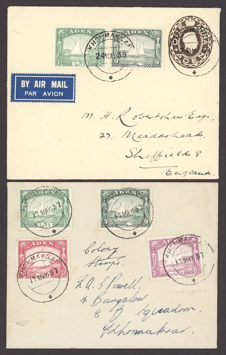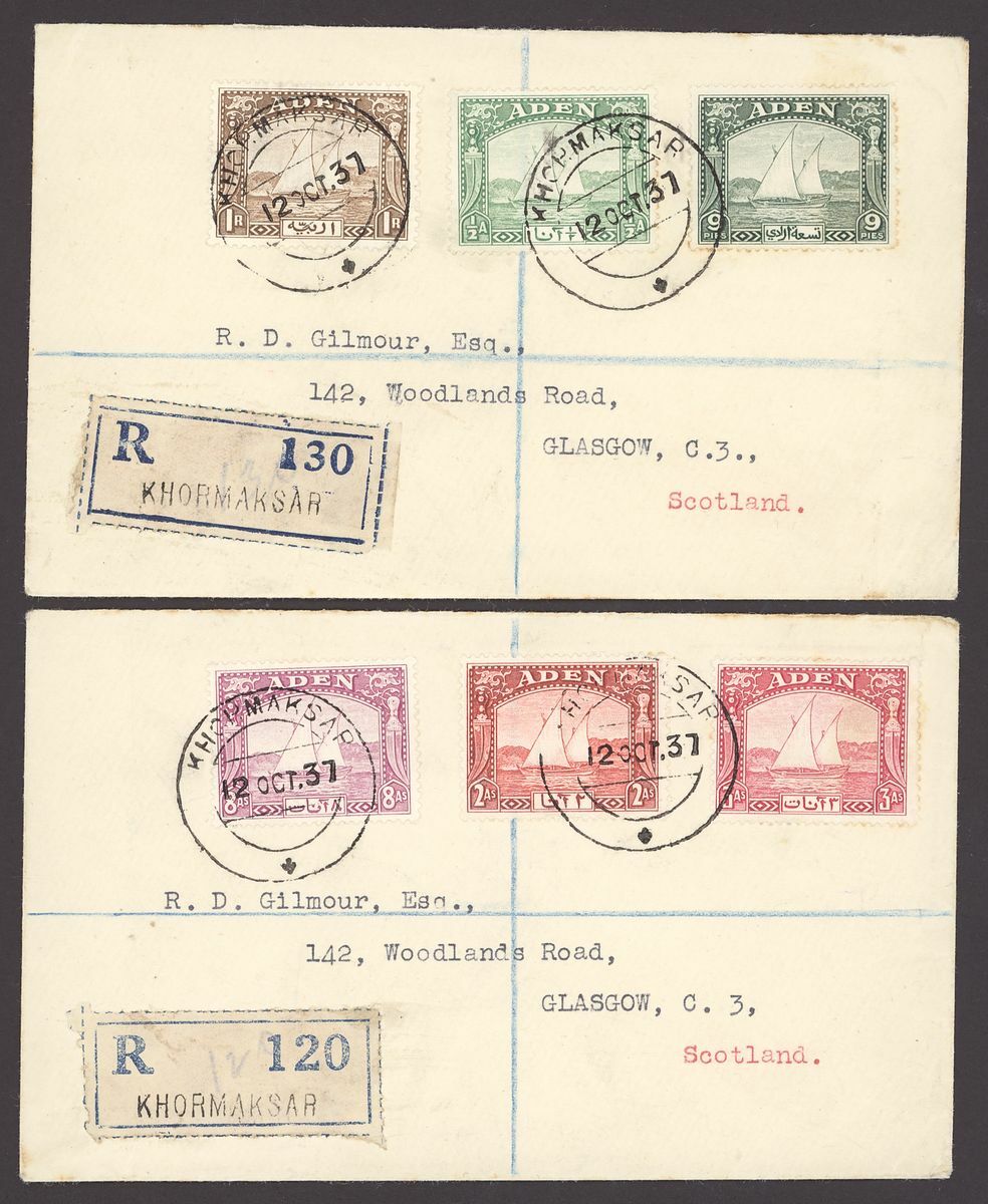1938 (17 May) locally addressed envelope bearing ½a., 9p., 3a. and 8a., (12 Oct.) Gilmour envelopes (2) registered to Glasgow bearing ½a., 9p. and 1r., and 2a., 3a. and 8a., and (13 Nov.) photographic postcard to England bearing ½a. and 1937 Coronation 1a. and showing horseshoe "