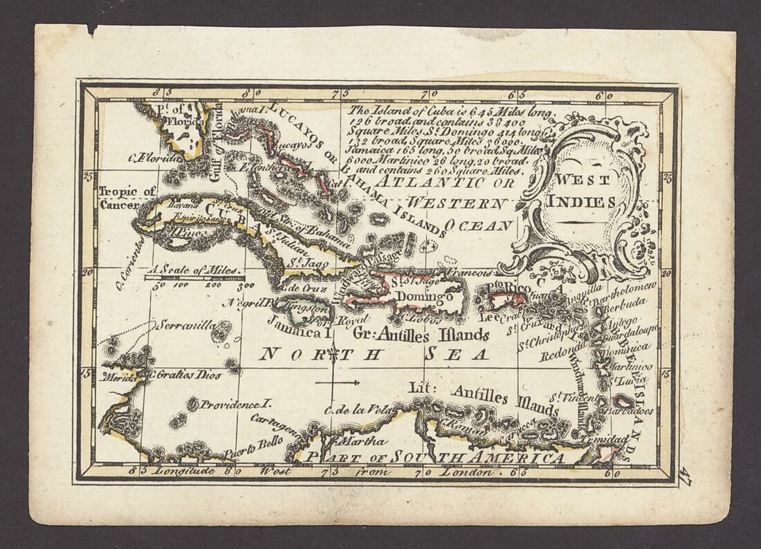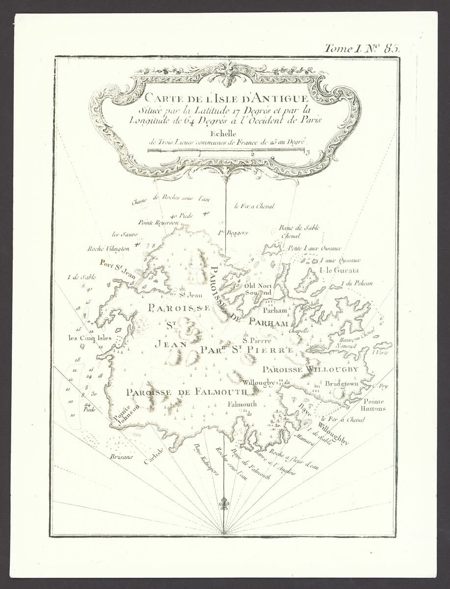 1758 map (110x80mm.) of the Caribbean by Emanuel Bowen & Gibson with decorative cartouche showing "Antigua" in the old spelling "Antego"; also a photographic reproduction of a Herman Moll map, 1700-1730, the frontispiece of the Freeland & Jordan book.