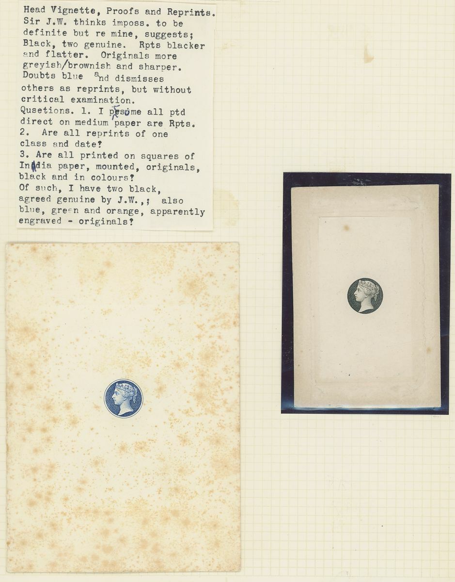 1854 Diadem Queen's Head vignette, a progressive die proof in black on India paper (38x63mm.) affixed on thin card (56x85mm.), small tone spot at top well clear of design. Very rare, one of two recorded in private hands; also similar reprinted? proof in blue on thin card (90x126mm.), very stained