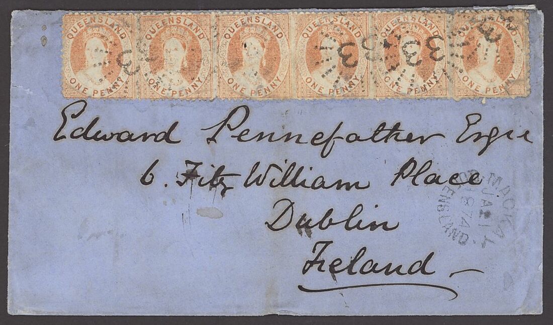 1874 (21 Jan.) envelope to Dublin, bearing 1868-74 perf 13 1d. orange-vermilion strip of six (one defective) clearly cancelled "33", showing