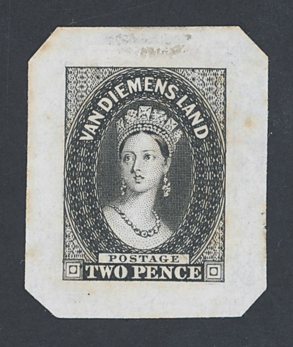 1855 2d. die proof in black on India paper (29x36mm.) with champhered corners; traces of ageing places, otherwise very fine. Rare