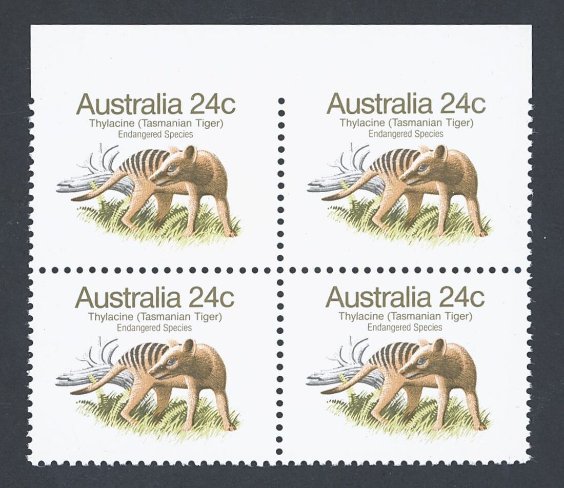 1981-83 24c. 'Tasmanian Tiger, top marginal block of four with the two upper examples with variety imperforate between margin and stamps, unmounted mint, upper right stamp with fingerprint mark on the upper corner otherwise fine and unusual. S.G. 788var