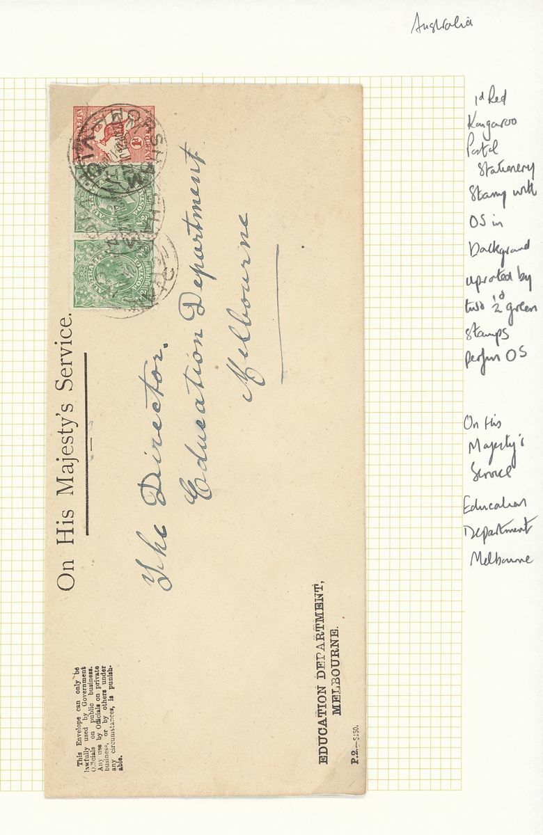 1913-14 1d. carmine duo including 1922 addressed to Melbourne and 1922 uprated with ½d. King George V Head perforated OS pair, both envelopes with some faults, still scarce. BW EO1, $500+.