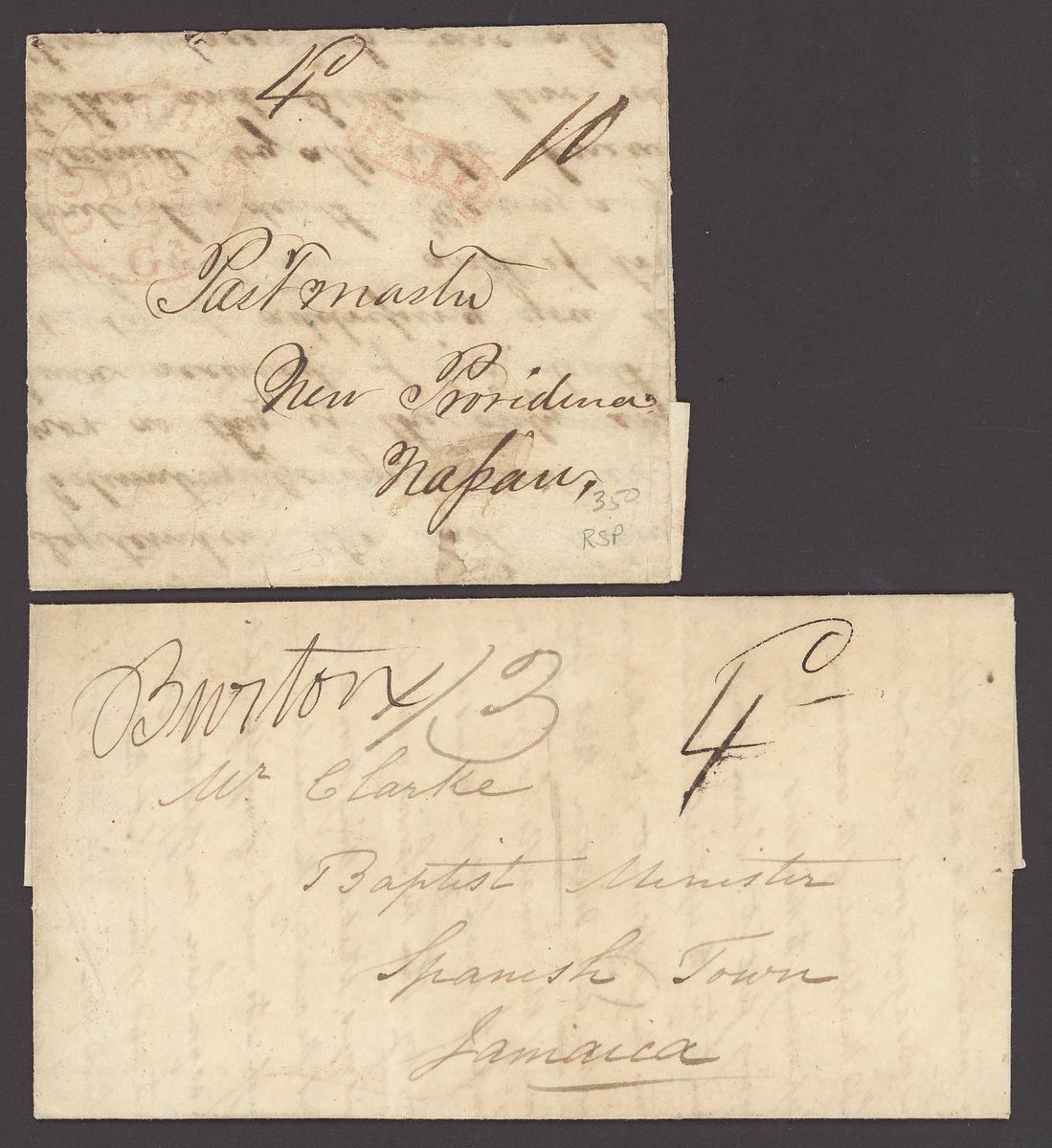 Two undated entire letters, one from Columbus to Nassau marked with "4d." ship letter rate and with corresponding scroll "