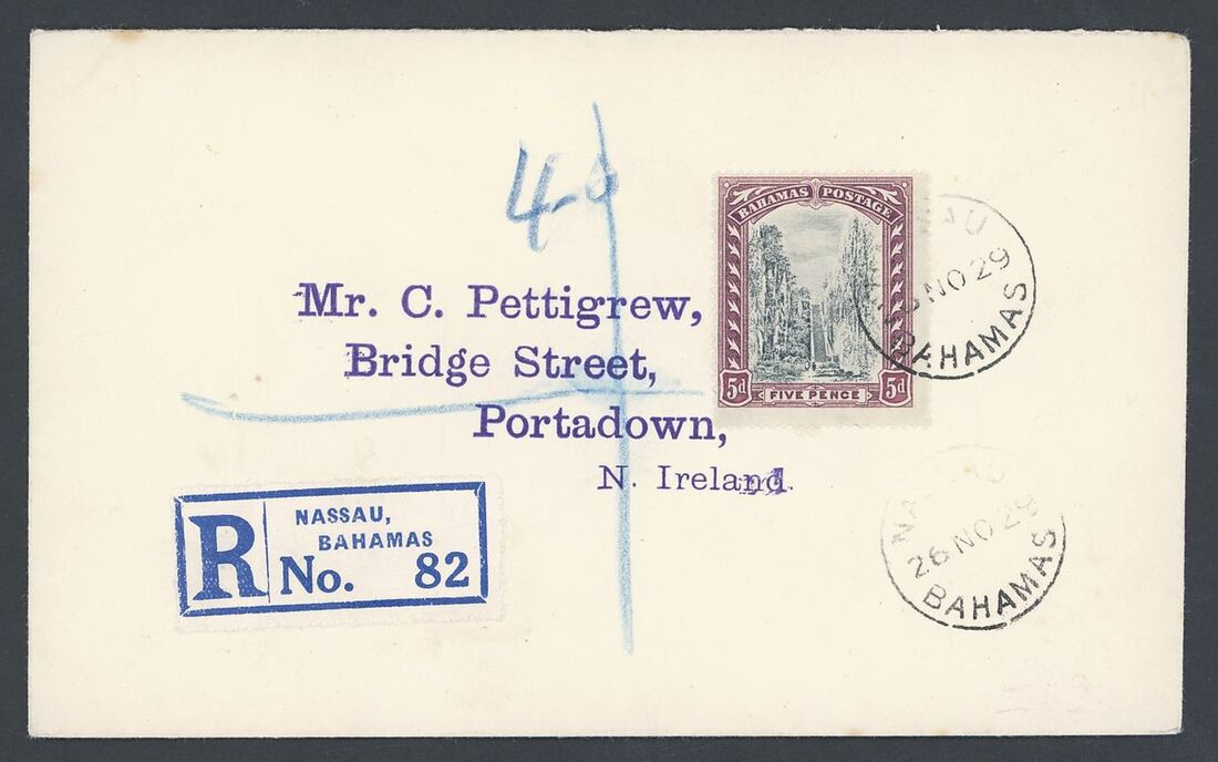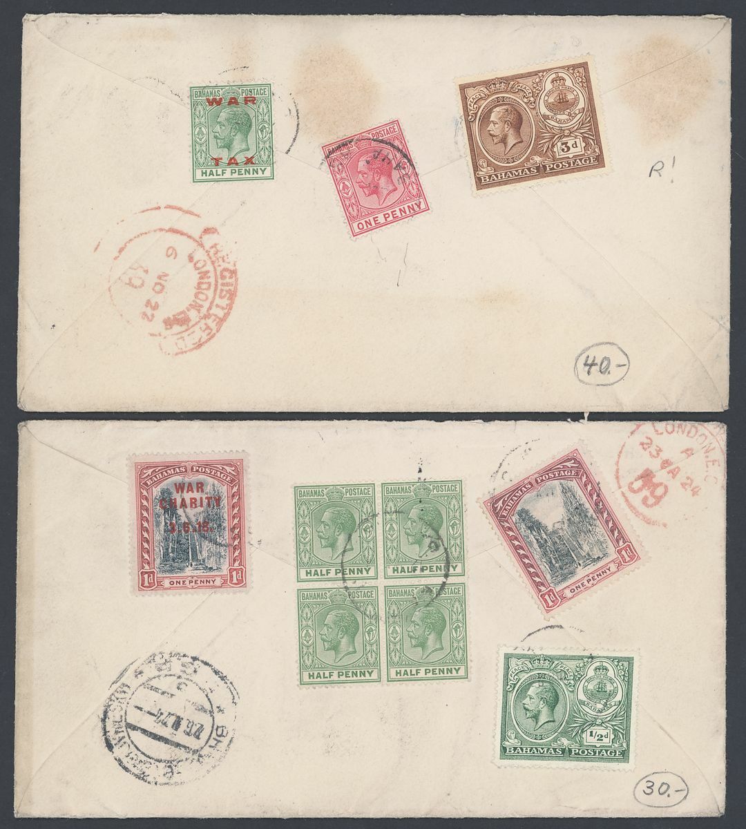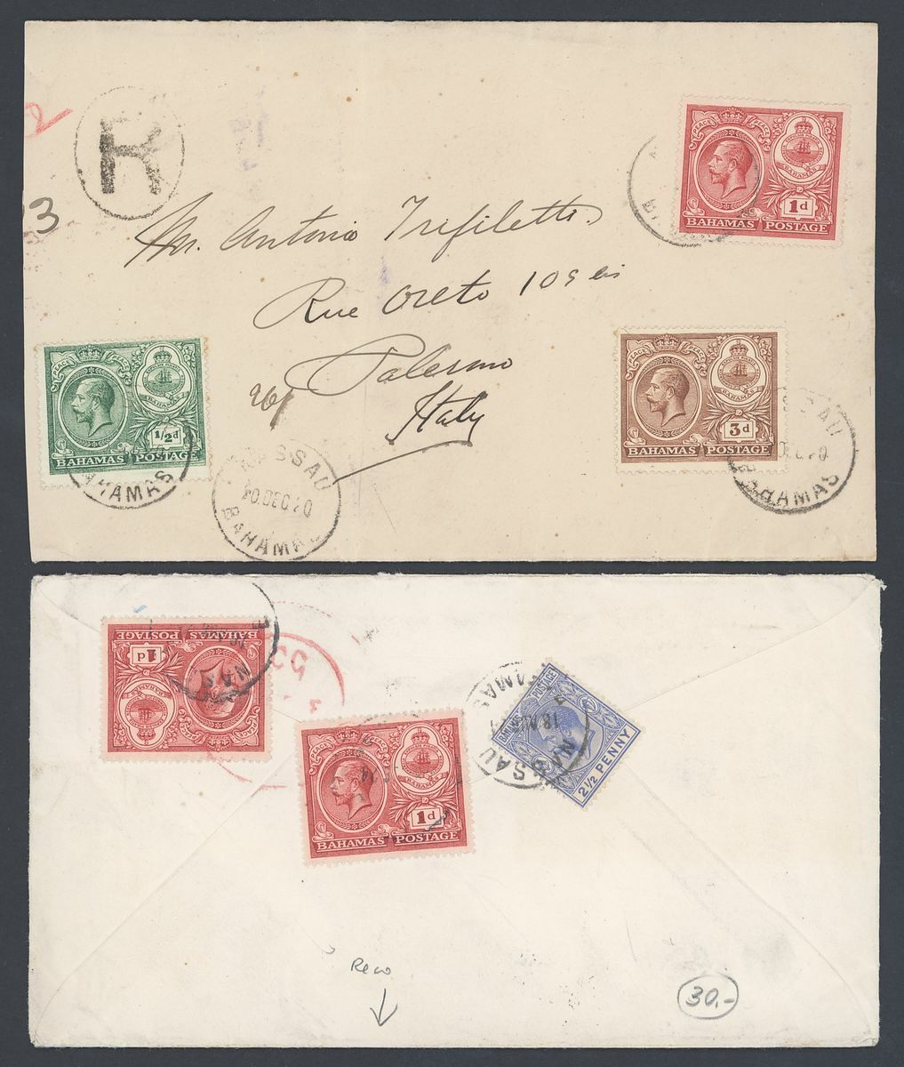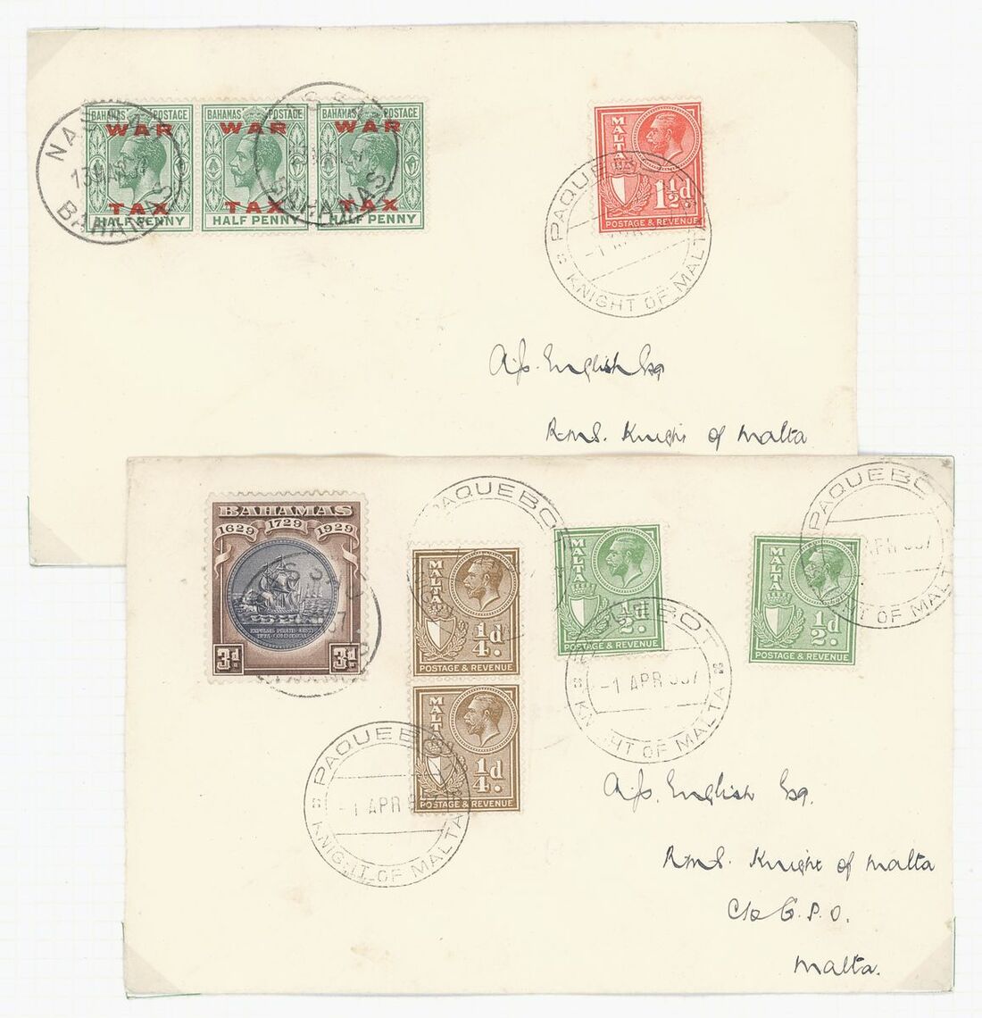 1920 (Dec.) envelope registered to Italy bearing Peace ½d., 1d. and 3d.; 1922-24 envelopes (3) from the same correspondence registered to Czechoslovakia bearing various issues, all on reverse; 1929 (26 Nov.) envelope registered to Northern Ireland bearing Staircase 5d.; and 1937 envelopes (2) ex the same correspondence from Nassau to Malta, one bearing War Tax ½d. (3) and Malta 1½d., the other bearing Tercentenary 3d. and Malta ¼d. vertical pair and ½d. (2), all the Maltese stamps tied by "