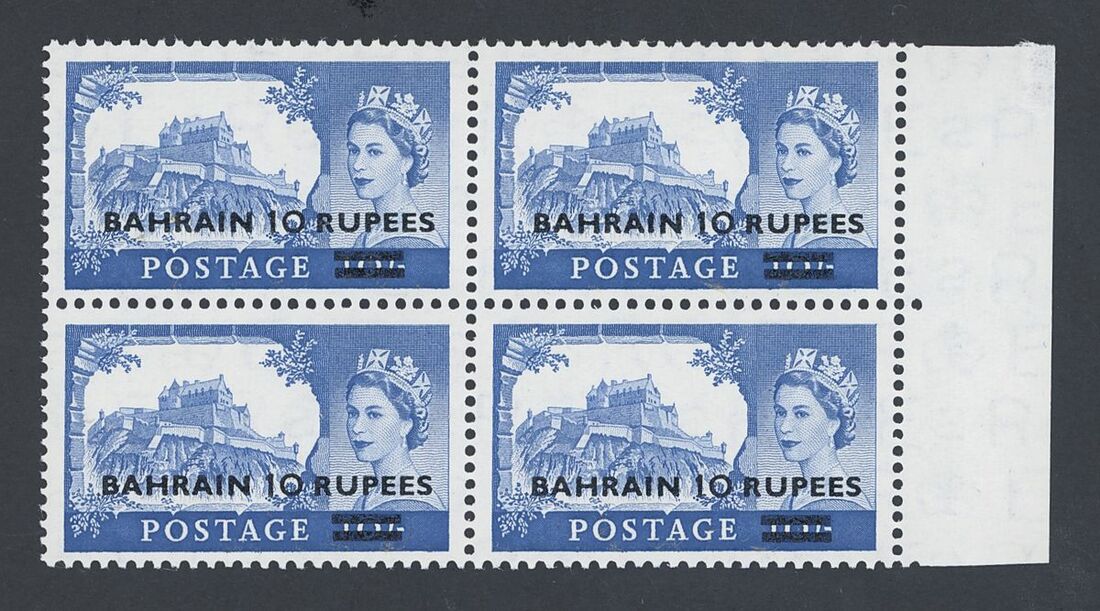 1955-60 10r. on 10/- ultramarine, surcharge type II on De La Rue printing, block of four from the right of the sheet, unmounted mint; fine and scarce. S.G. 96ab, £400+.