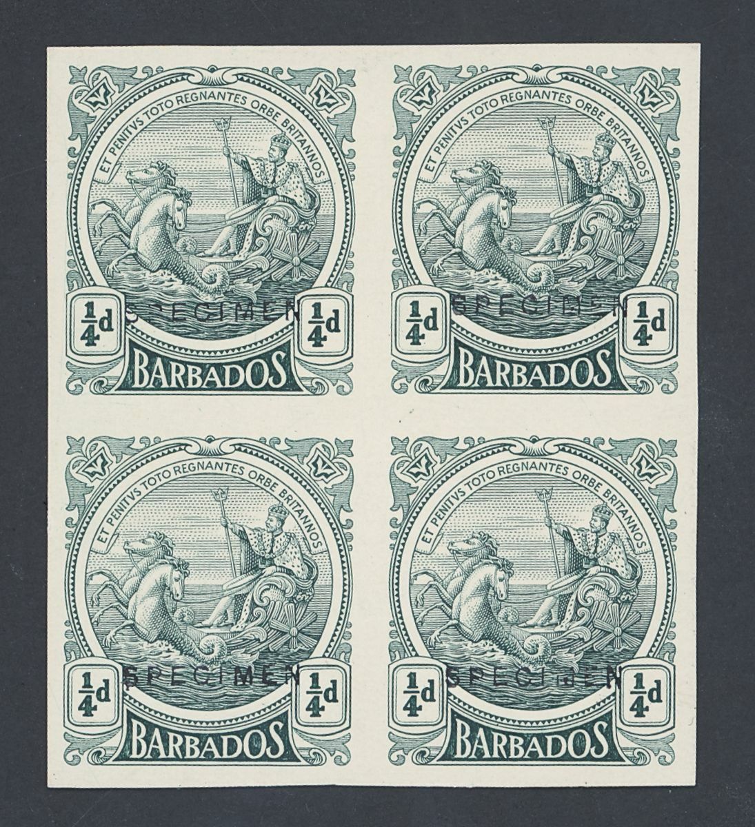 1916-20 ¼d. green block of four imperforate printer's sample on thick ungummed paper, each overprinted "