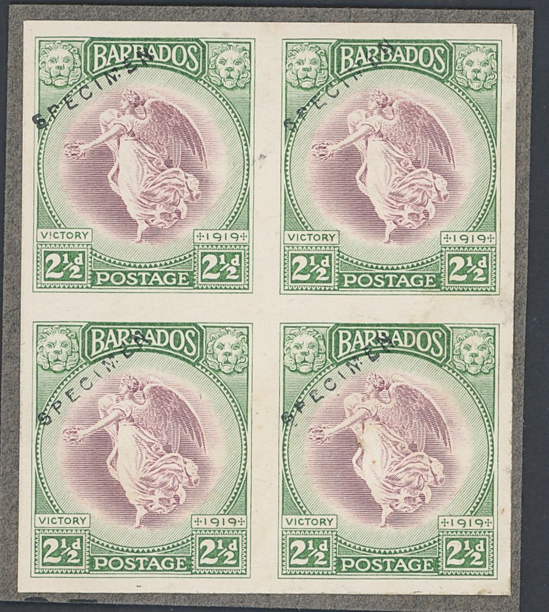 1920 2½d. imperforate printer's sample in purple and yellow-green, a block of four, each handstamped "