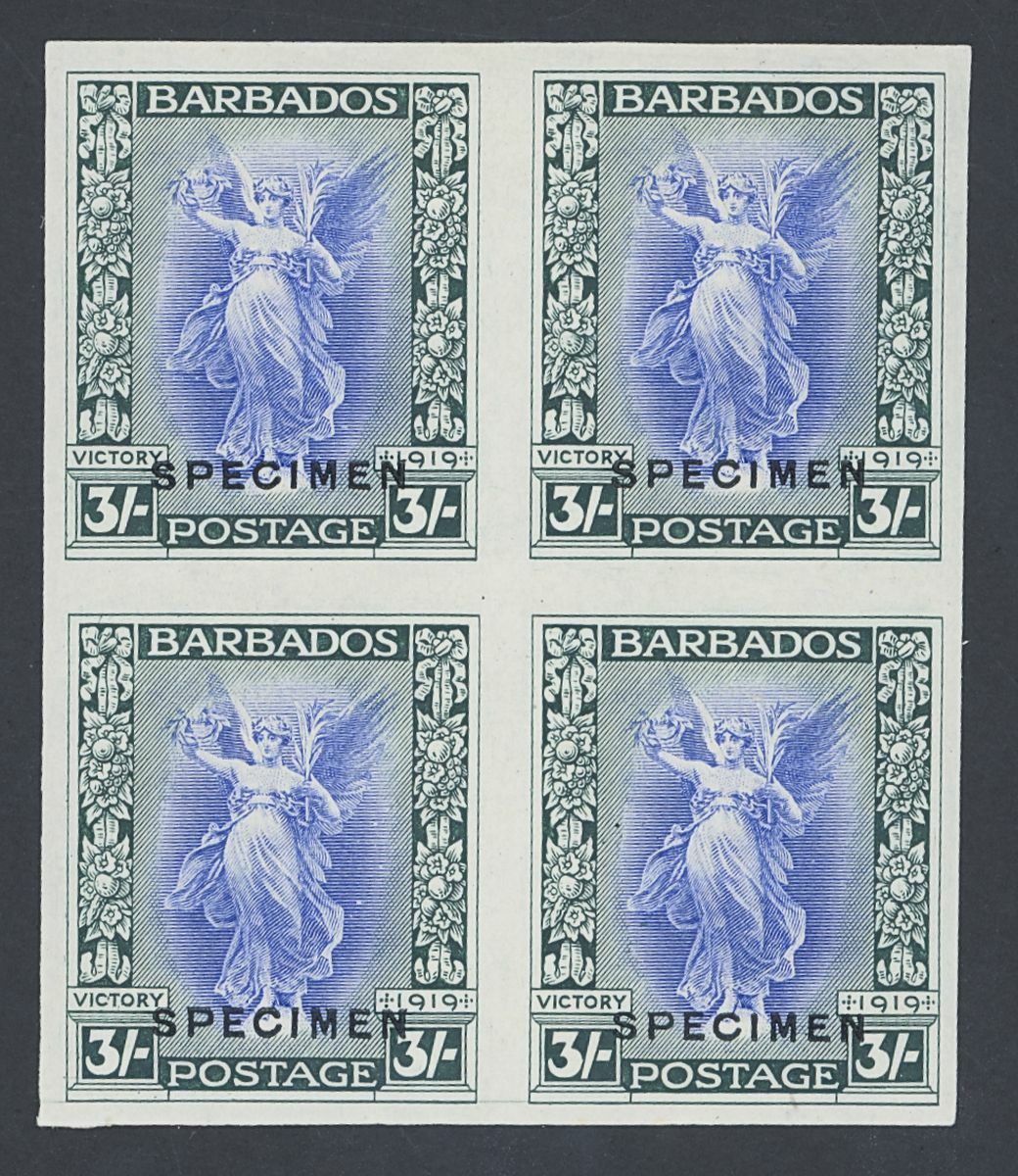 1920 3/- imperforate printer's sample in blue and grey-green, a block of four on gummed unwatermarked paper, each overprinted "