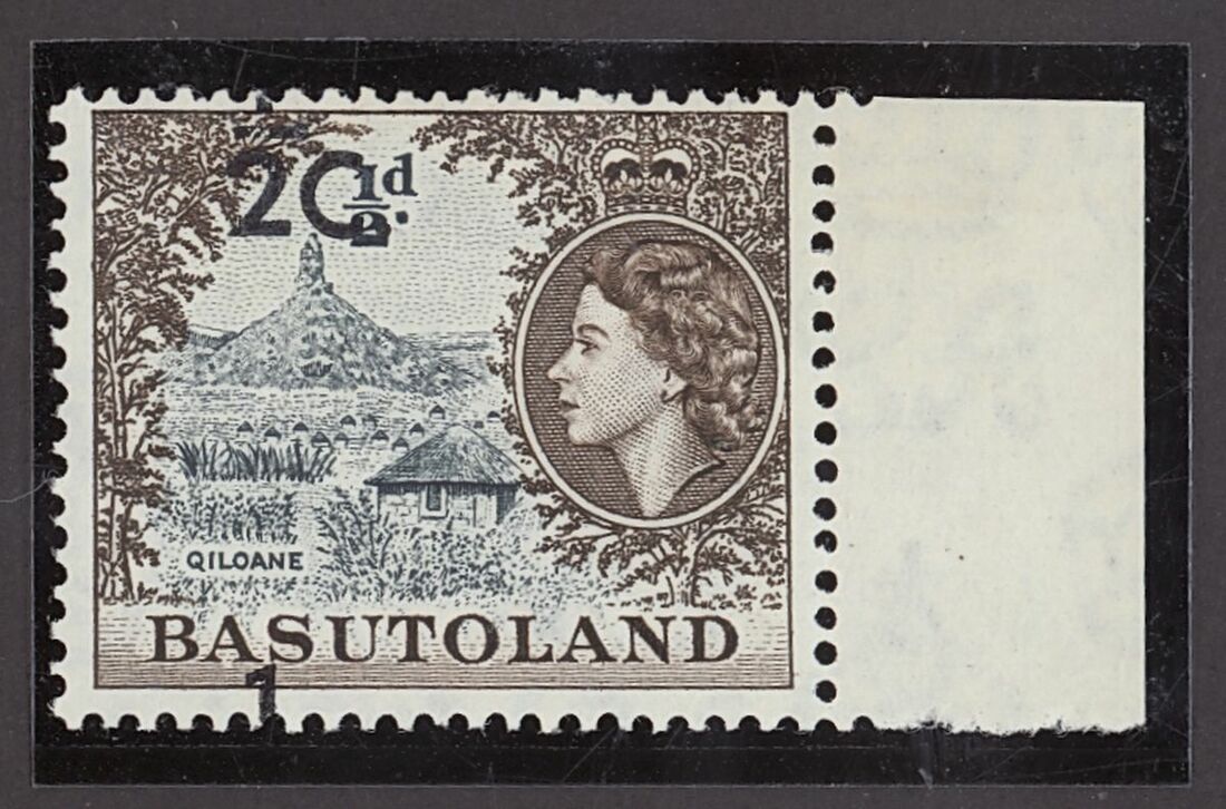 1961 ½c. on ½d. grey-black and sepia marginal example from the right of the sheet, variety surcharge misplaced 16mm. to foot, fine unmounted mint. Spectacular