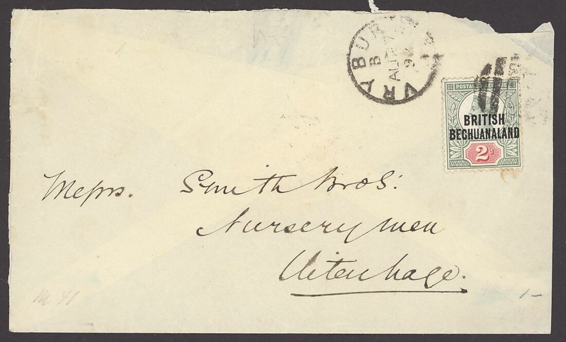 1892 (27 Aug.) envelope to Uitenhage, bearing 1891 2d. tied by unclear barred numeral, showing Vryburg c.d.s. alongside and, on reverse, Midland T.P.O. Down (29.8) and arrival datestamps