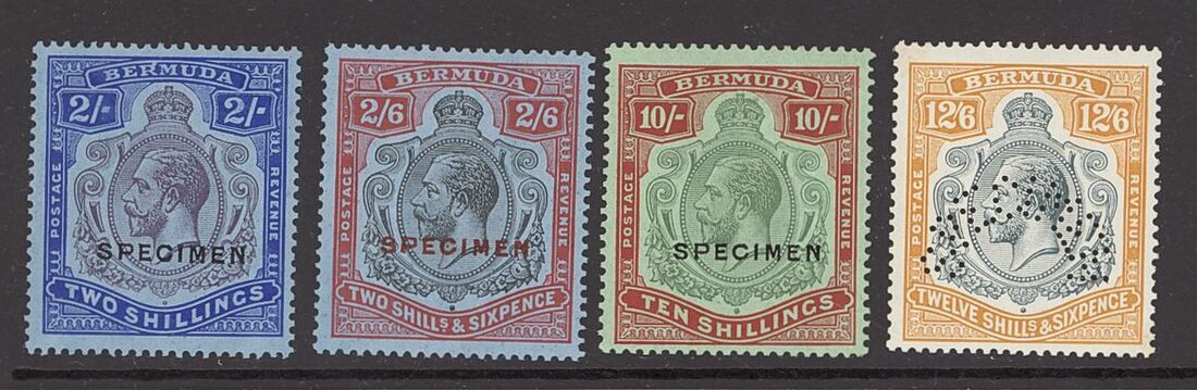 1924-32 Script 2/-, 2/6d., 10/- and 12/6d., each overprinted or perforated