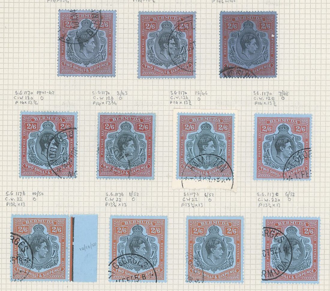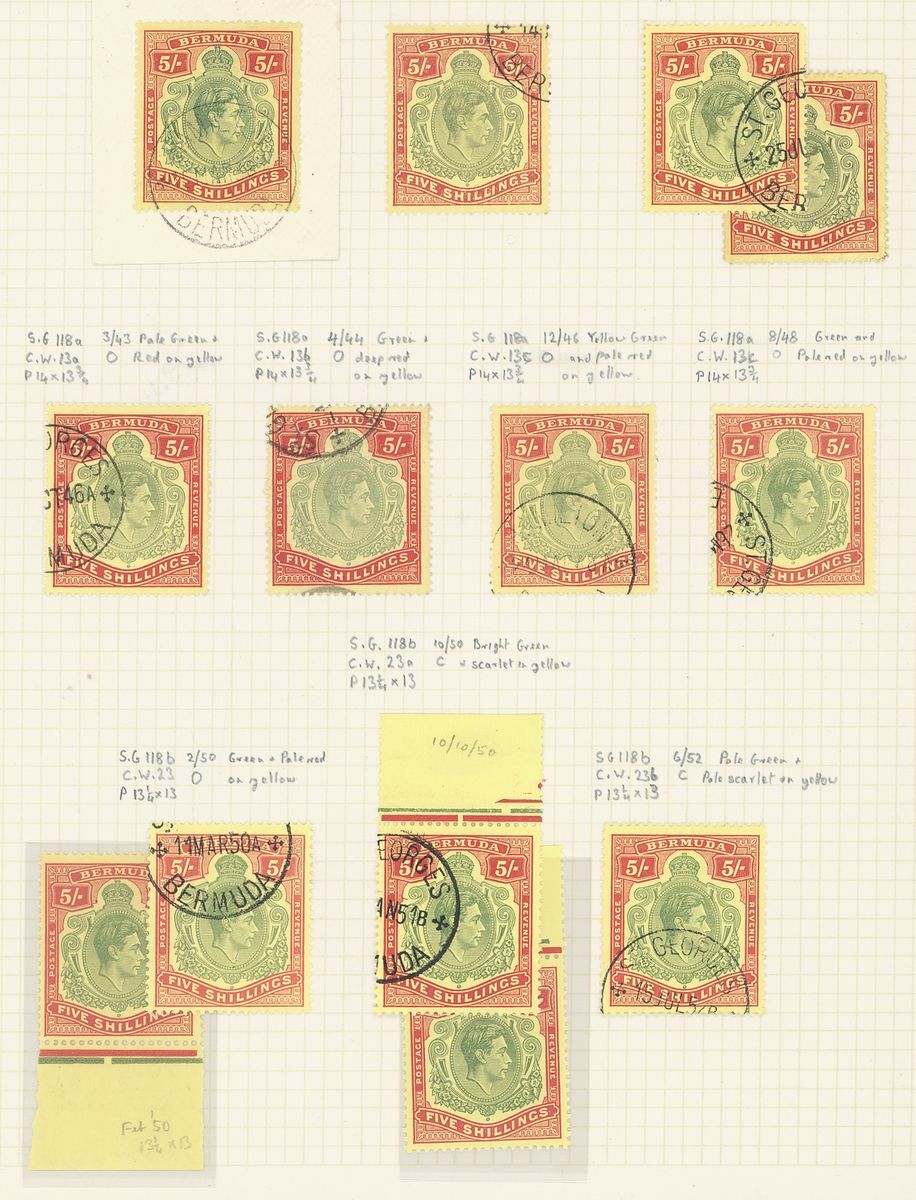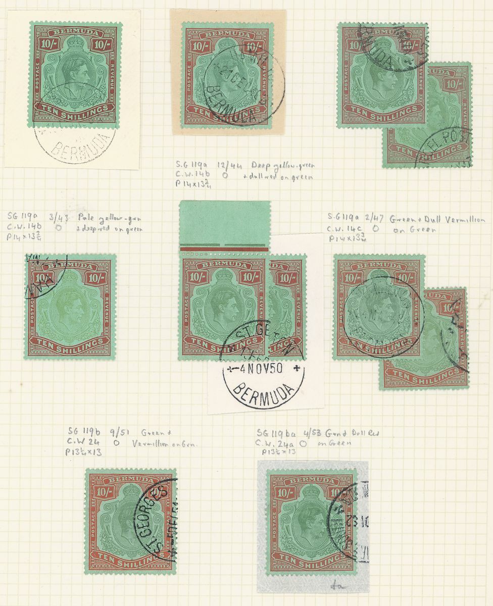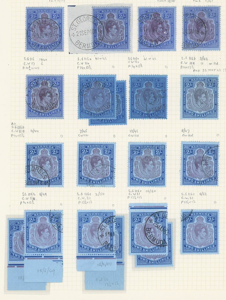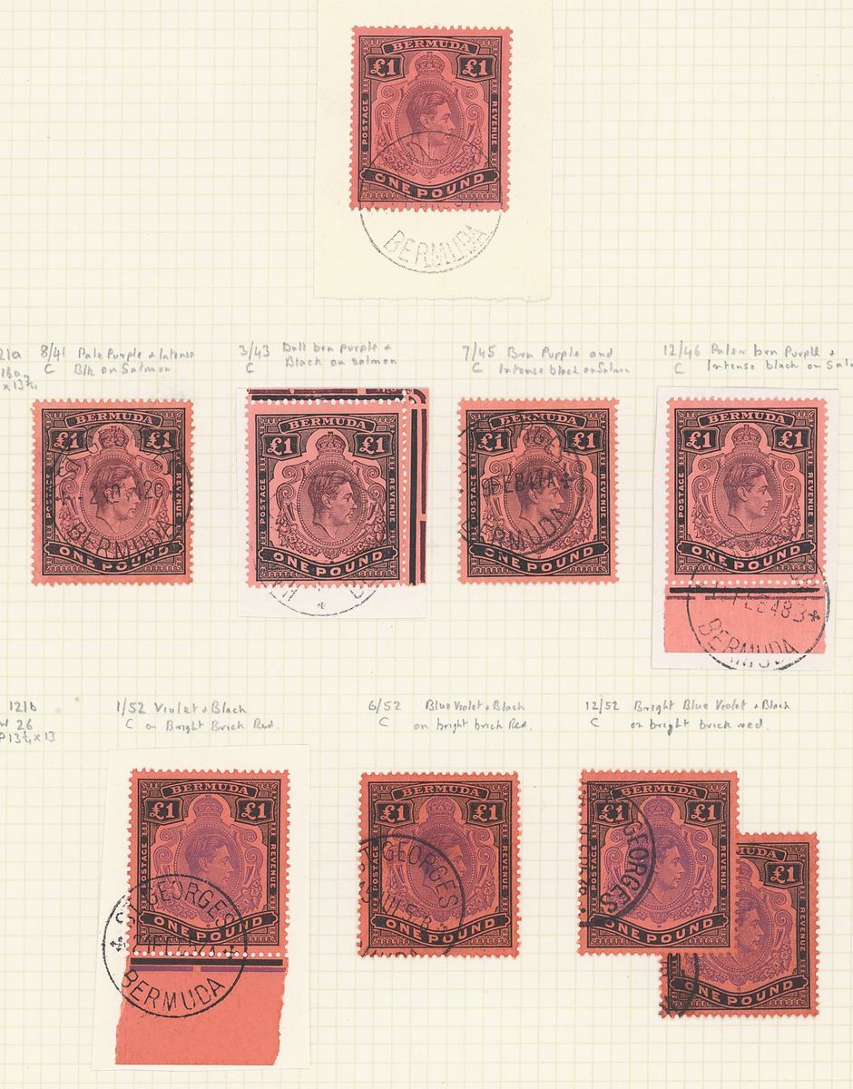 1938-52 2/- to £1 duplicated mainly used selection arranged on annotated album pages with stamps identified per type by S.G. numbers including 2/- (20, three mint and seventeen used), 2/6d. (11), 5/- (13, two mint and eleven used), 10/- (10), 12/6d. (11, two mint and nine used), £1 (9), classification to be checked but mostly believed to be correct, generally fine.