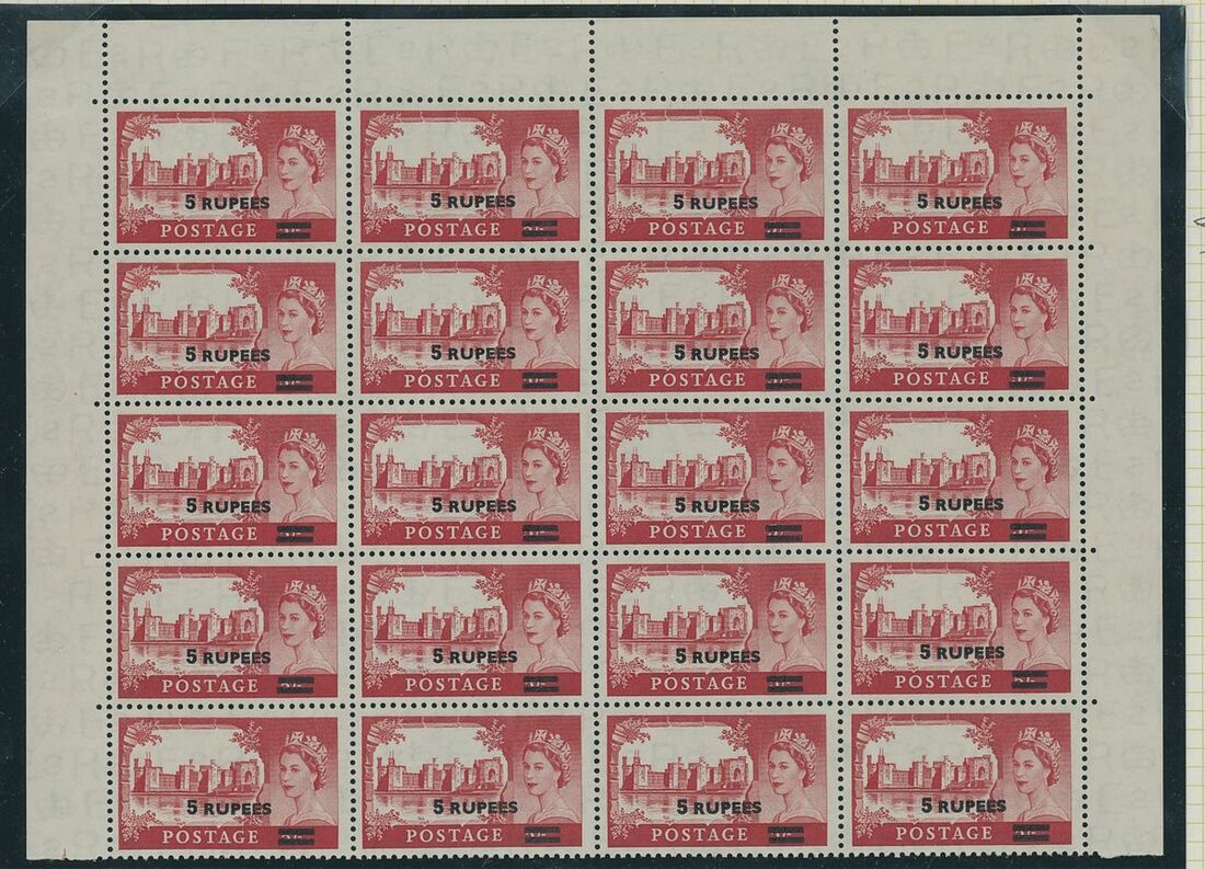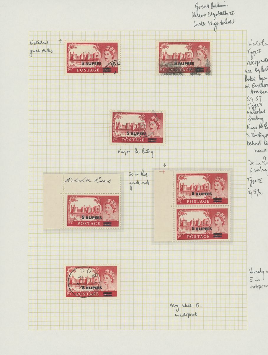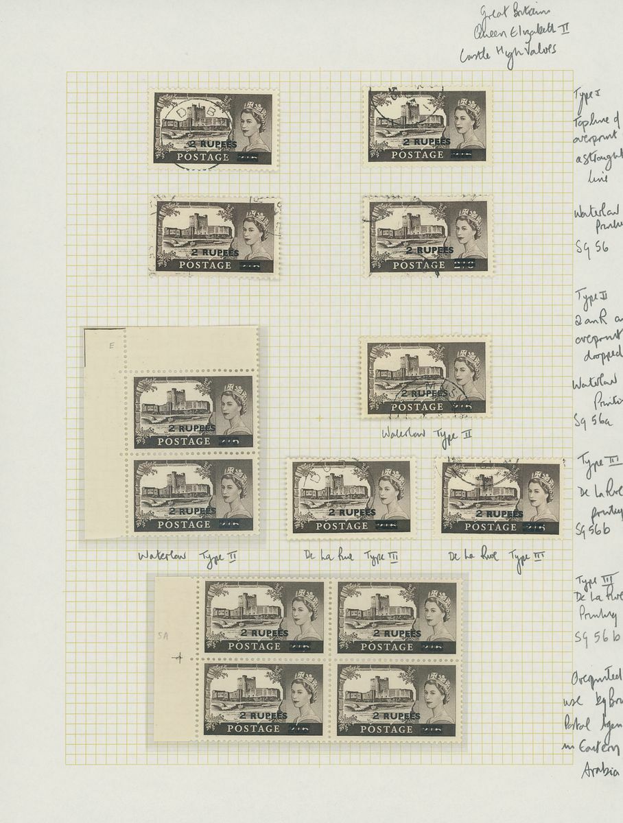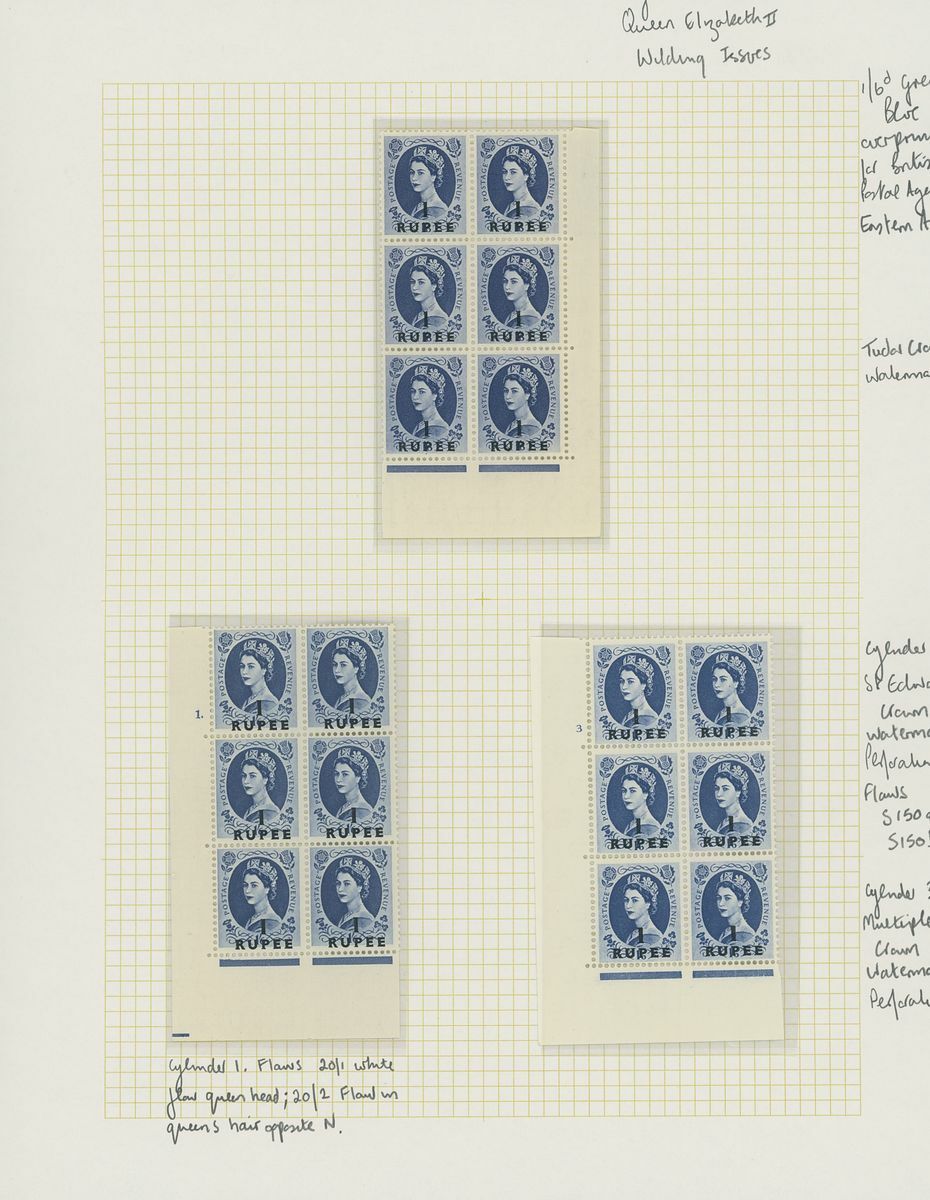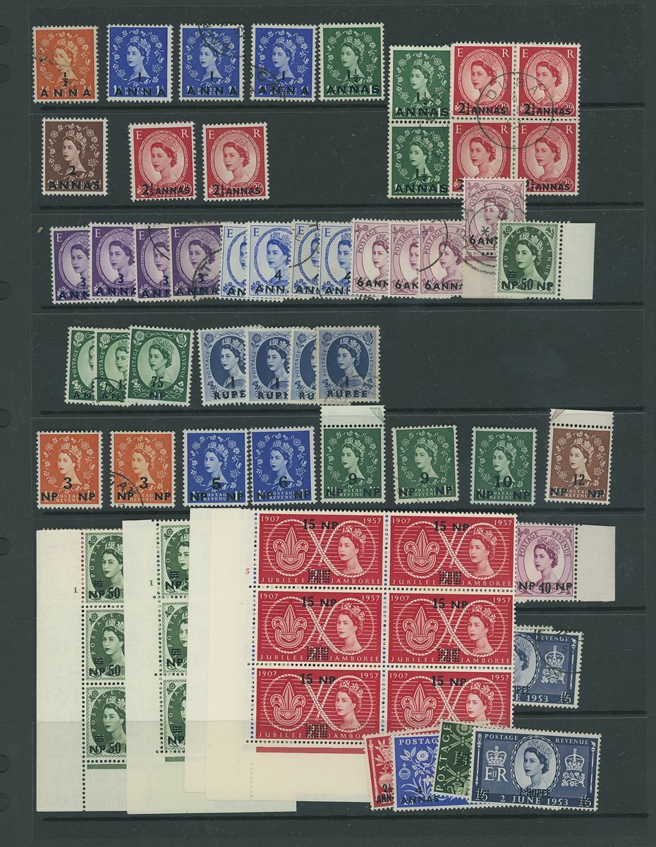 1952-61 surcharges on Great Britain, mostly mint collection on pages, including 1952-54 12a. on 1/3d. (2) 1r. on 1/6d. cylinder number blocks of six, 1955-56 2r. on 2/6d. type III block of four, 5r. on 5/- type II (3 and block of twenty), 1956-57 4a. on 4d., 1r. on 1/6d. (2) cylinder number block of six, 1960-61 75np. on 1/3d. (2 cylinder number blocks of six), etc., chiefly fine