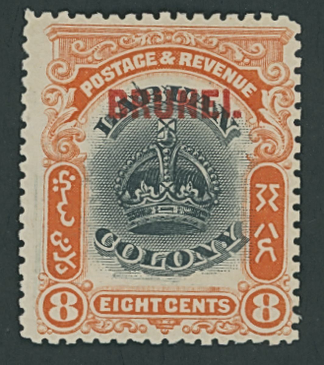 1906 8c. black and vermilion showing variety line through "B", mint large part original gum, a diagonal bend not effecting the fresh appearance, still a scarce variety with only 80 possible examples. S.G. 17a, £500.
