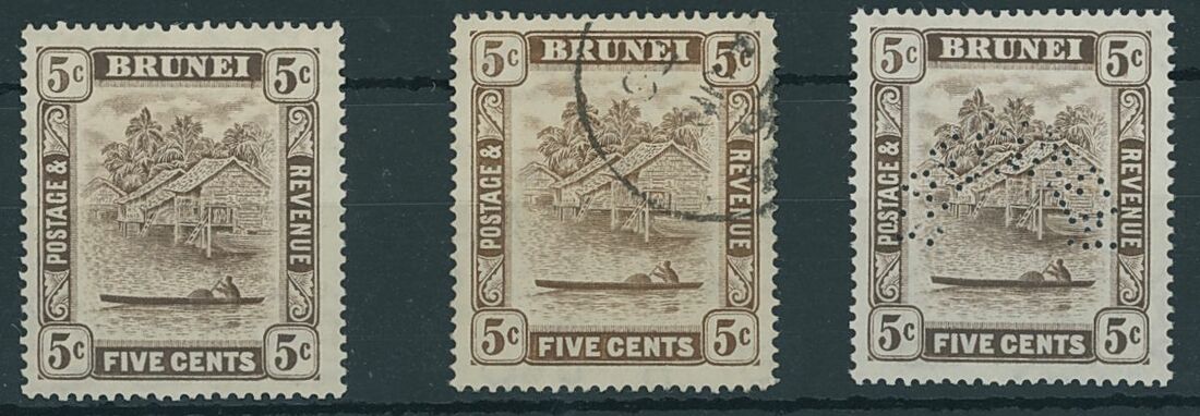 1922-37 5c. chocolate, variety '5c.' retouch (3), Specimen, mint and used, fine and rare trio. S.G. 68a