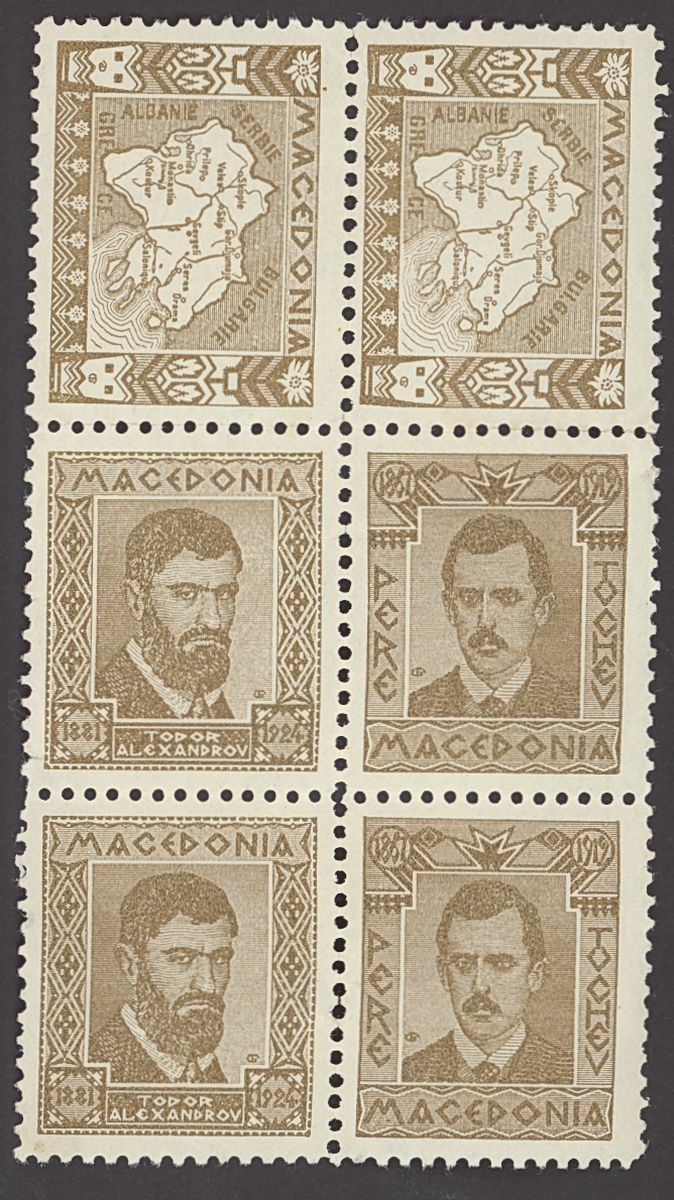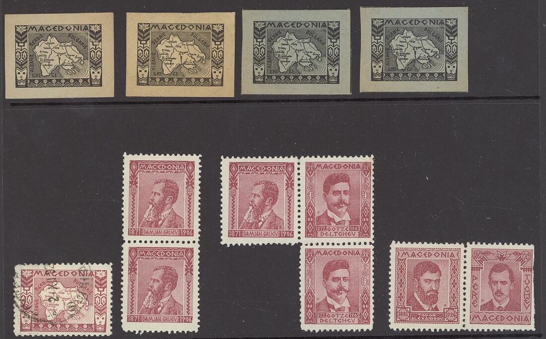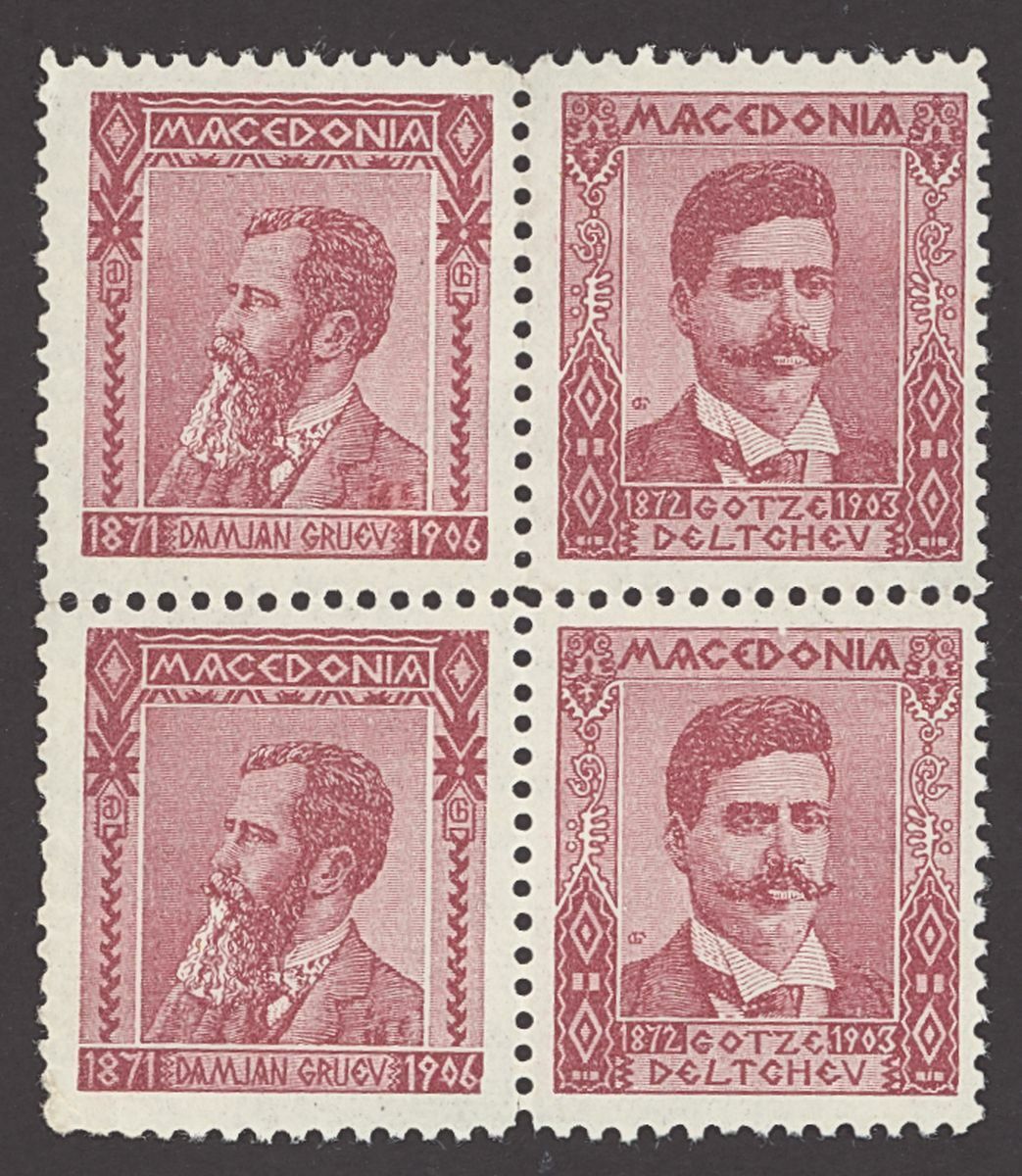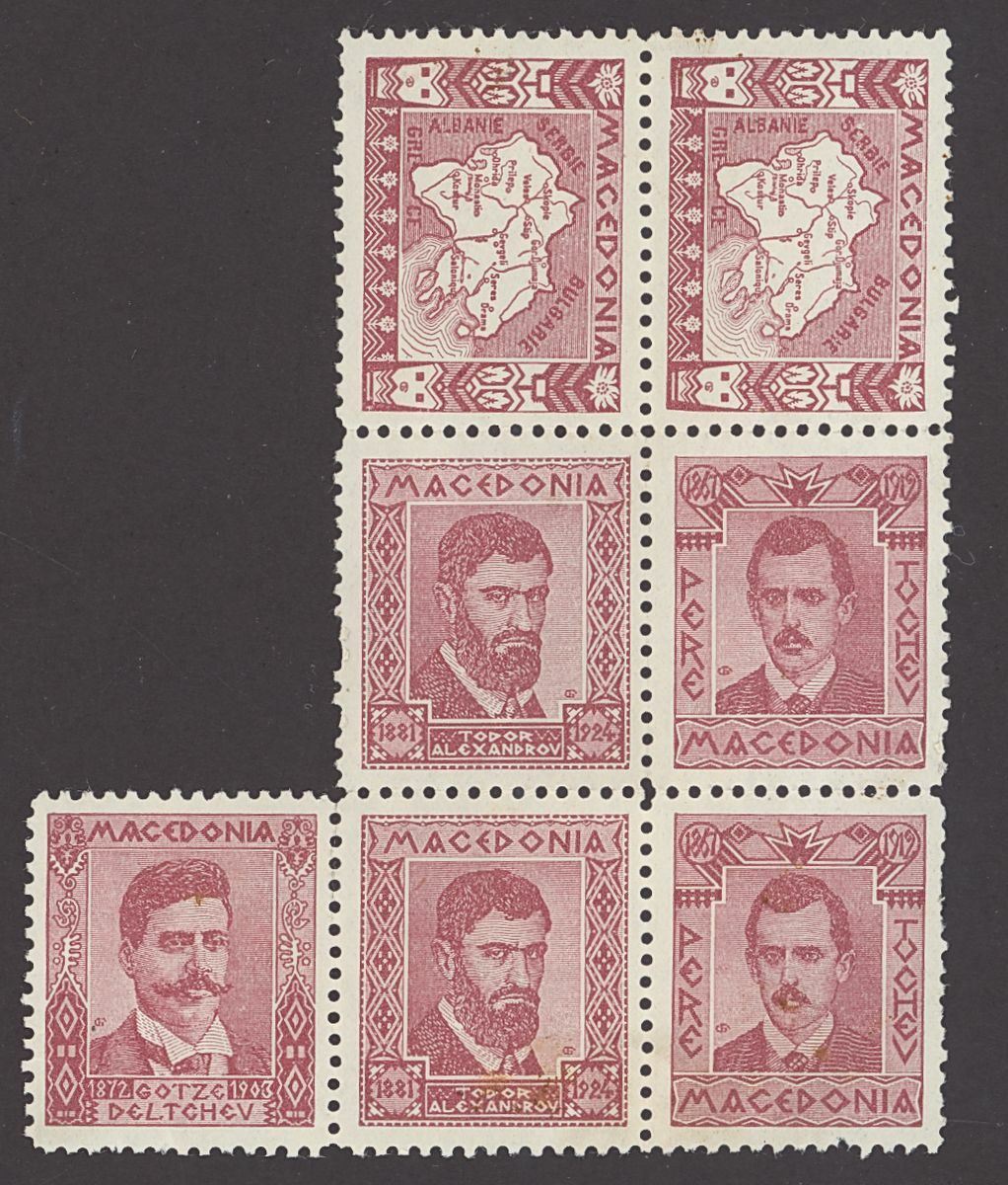 1920s selection (65) of private cinderella/labels depicting the revolutionary leaders "Damian Gruev", "Gotze Deltchev", Todor Alexandrov", "Pere Tochev" and "Map of Mecedonia", printed by the revolutionary movement IMRO (Internal Macedonian Revolutionary Organization)" including in brown (44) mint and red (21, one cancelled). Also four cut outs from cards with "Map of Mecedonia". Generally fine, a most unusual and interesting group.