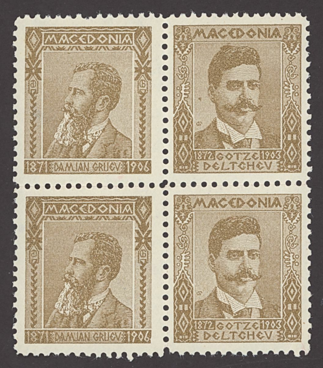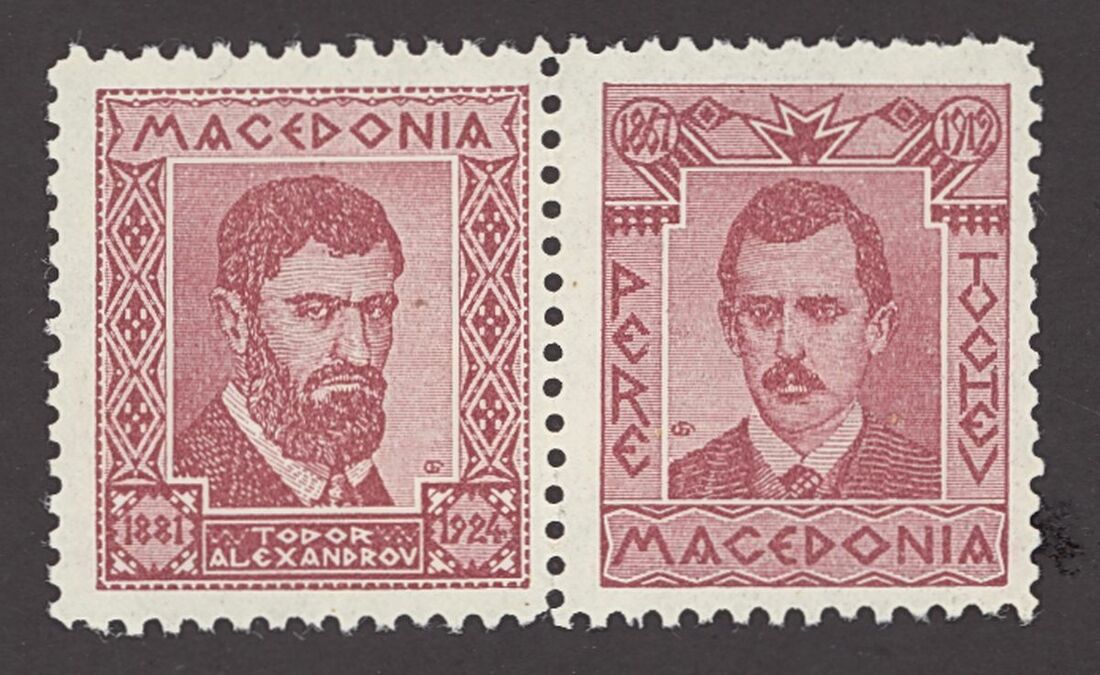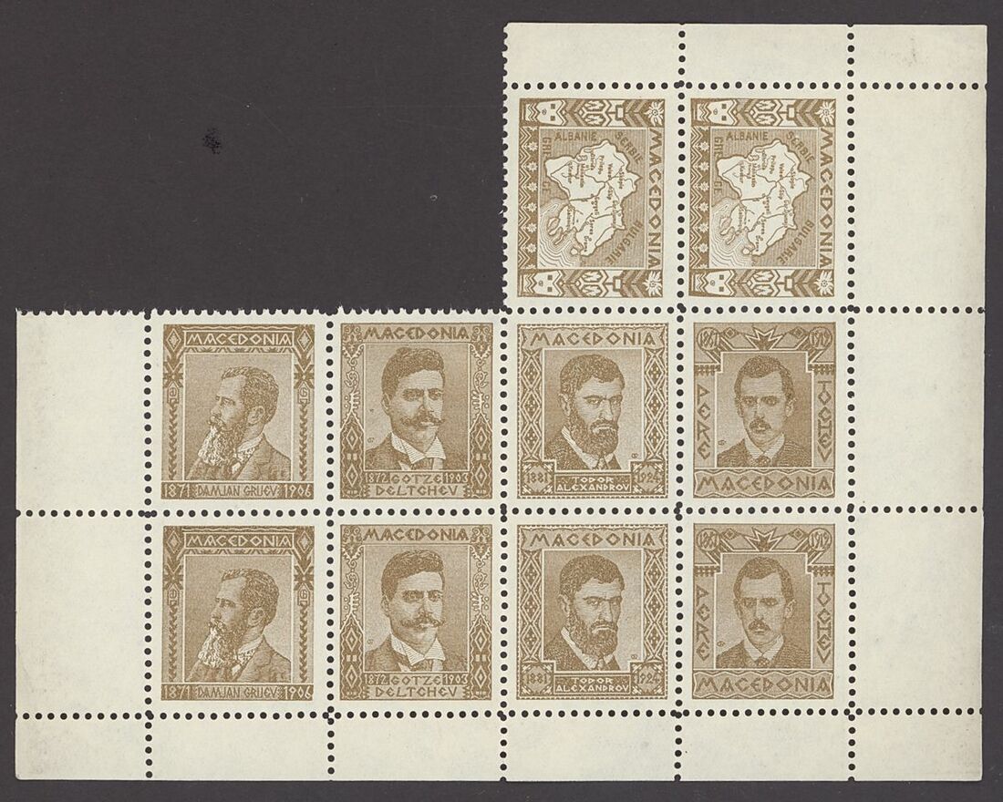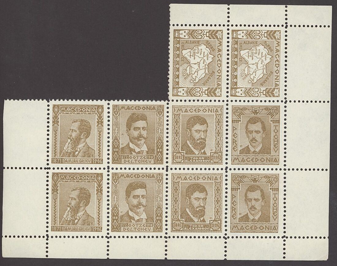 1920s selection (65) of private cinderella/labels depicting the revolutionary leaders "Damian Gruev", "Gotze Deltchev", Todor Alexandrov", "Pere Tochev" and "Map of Mecedonia", printed by the revolutionary movement IMRO (Internal Macedonian Revolutionary Organization)" including in brown (44) mint and red (21, one cancelled). Also four cut outs from cards with "Map of Mecedonia". Generally fine, a most unusual and interesting group.