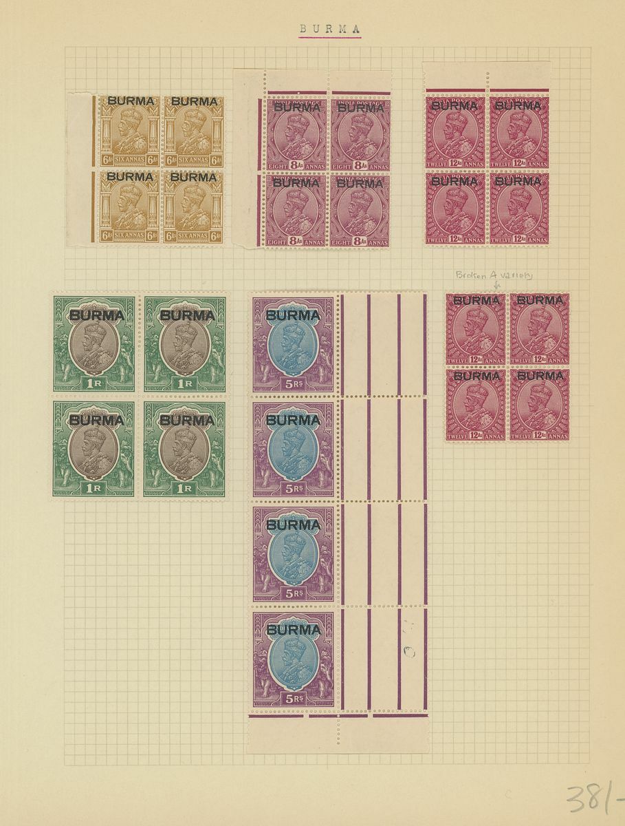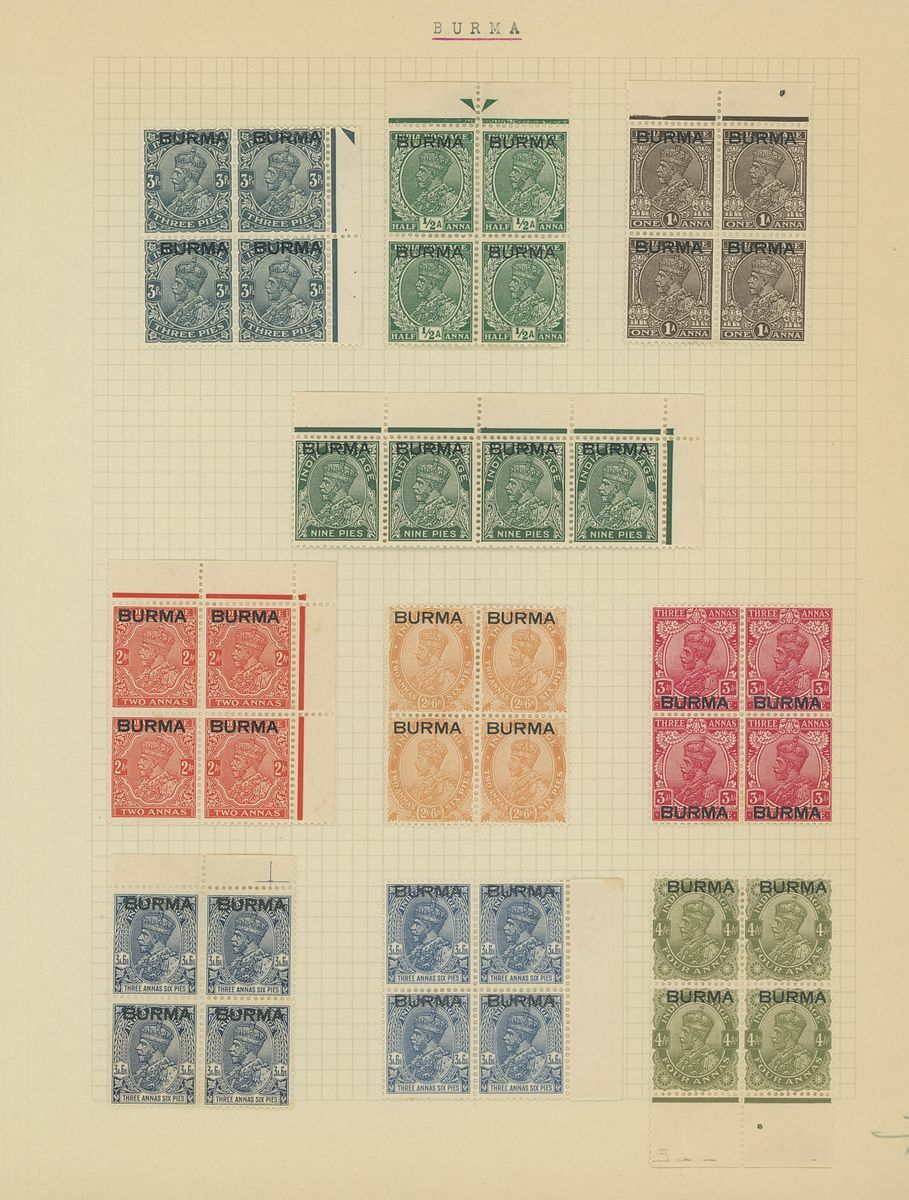 1937 (1 Apr.) 3p. to 1r. with 3a.6p. shade and additional 12a. in blocks of four except 9p. which is a corner strip of four, and 5r. vertical corner strip of four with interpanneau margin at right, fresh and fine mint. S.G. 1-13, 15, £986
