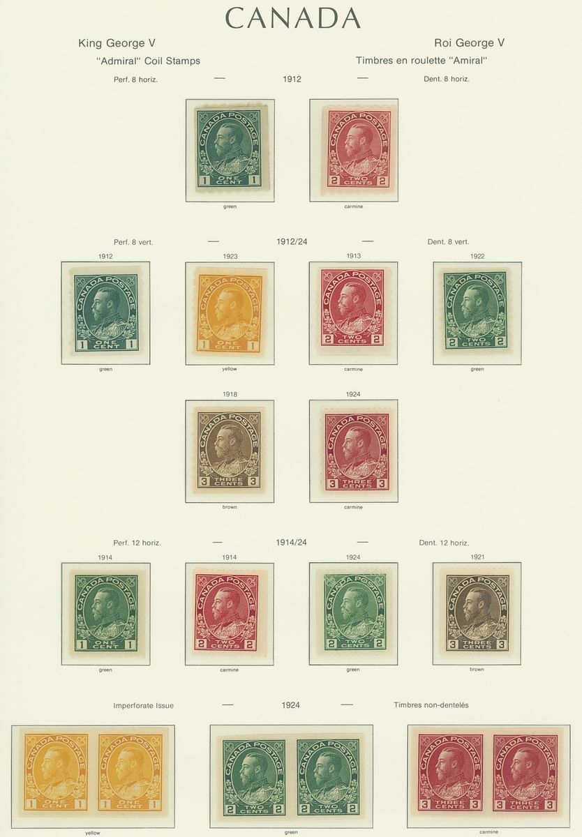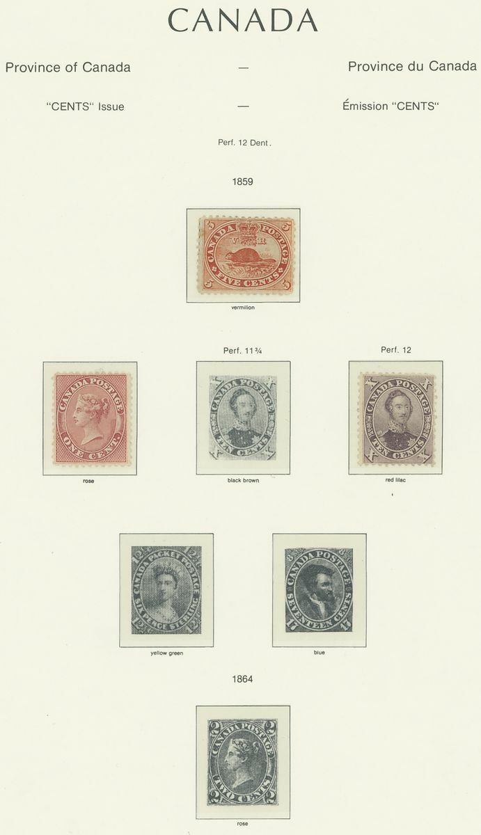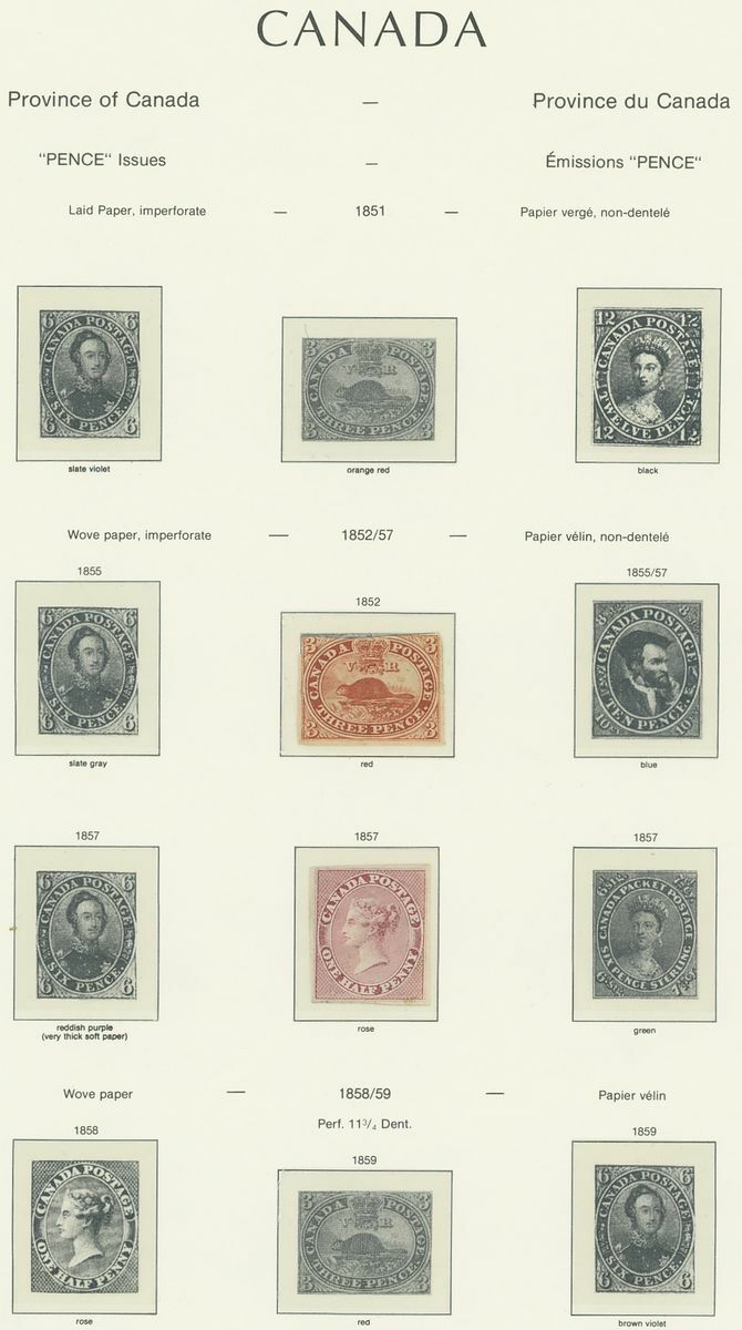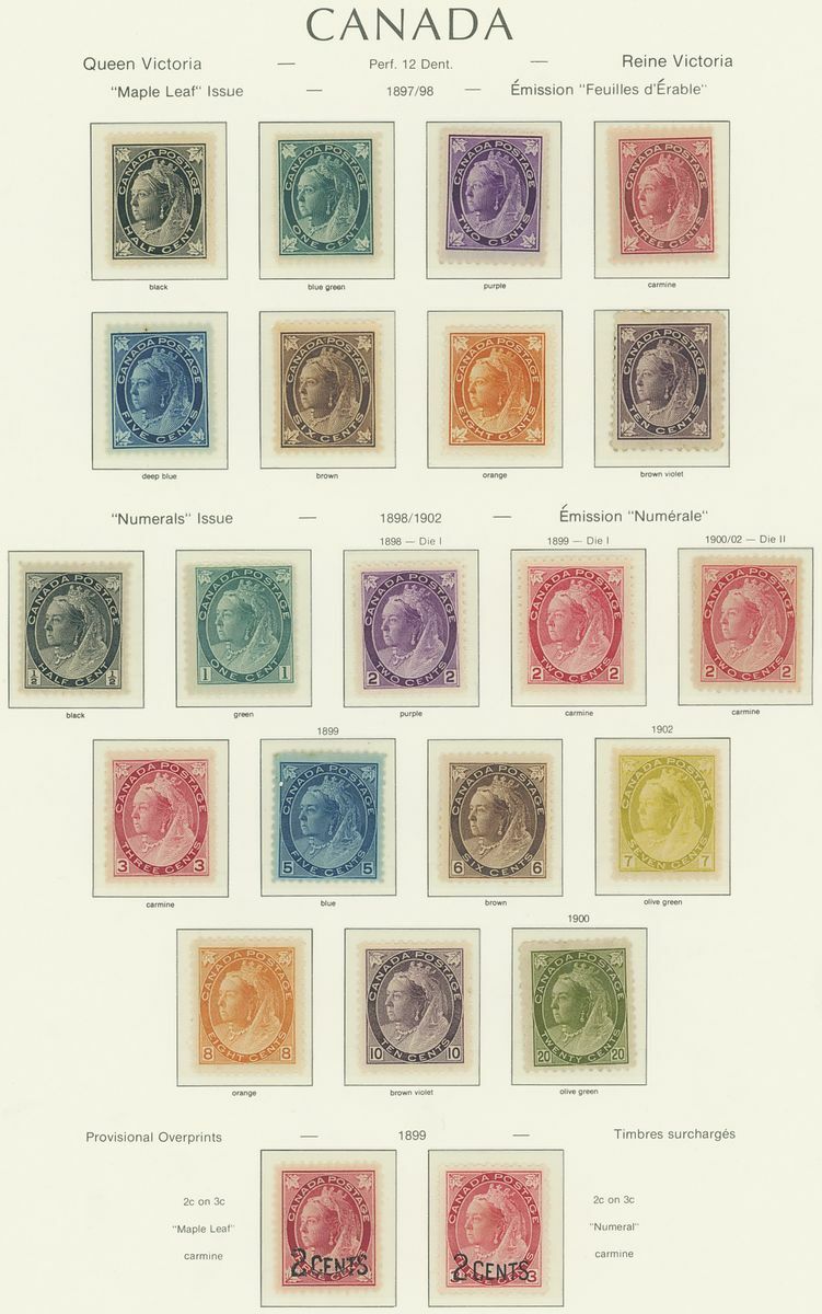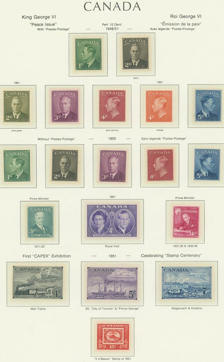 1851-1952 mint collection, attractively arranged in a Lighthouse hingeless album, with many desirable and high-cataloguing items, beginning with 1852 3d red (into design at top, small thin), 1857 ½d rose (small scuff at foot, margins full to just clear), 1859 5c vermilion, nicely centered 1c rose, and 10c red lilac, strong run of Large Queens, with each denomination represented, the 15c in multiple shades, one 1c value showing portion of Bothwell watermark (reperforated), near-complete Small Queens for the available spaces, noting many shades, as well as jumbo-margin ½c, fine 5c olive and pleasing 10c dull rose-lilac and brown-red, 1c perf 11.5x12 (hinge thin), 1897 Diamond Jubilee complete, the dollar values chiefly with desirable and select centering, 1897/1902 Maple Leaf and Numeral Issues complete, the 7c to 10c Numerals particularly well centered, King Edward VII & Quebec Tercentenary complete, noting rich fresh colours, complete basic run of Admirals including coil singles, 1917 Confederation through 1951 coils complete, chiefly fine-very fine, with a spot-check yielding several never hinged examples, including the 50c Grand Pré and $1 Mount Edith Cavell, fulsome back-of-the-book including complete airmails, 2c to 8c registration stamps including shades, Admiral War Tax complete including the scarce 2c+1c brown Die I, fresh Special Delivery issues including a very fine 1898 10c, complete official overprints, most with select centering, chiefly no gum to the end of the Large Queens, then largely hinged from thereon, the odd fault to be expected particularly among the Victorian issues, a few certificates accompany, a chiefly fresh and fine collection which took tremendous effort to assemble.