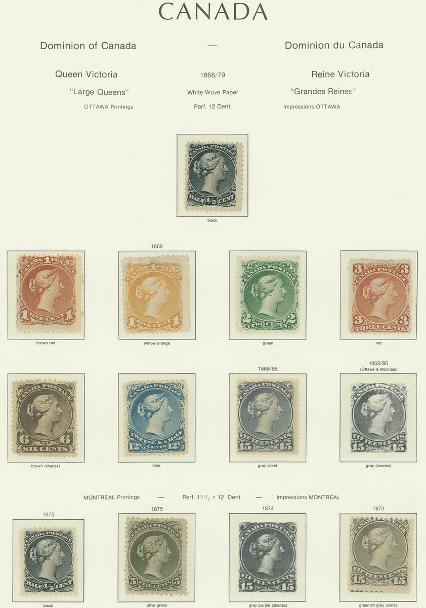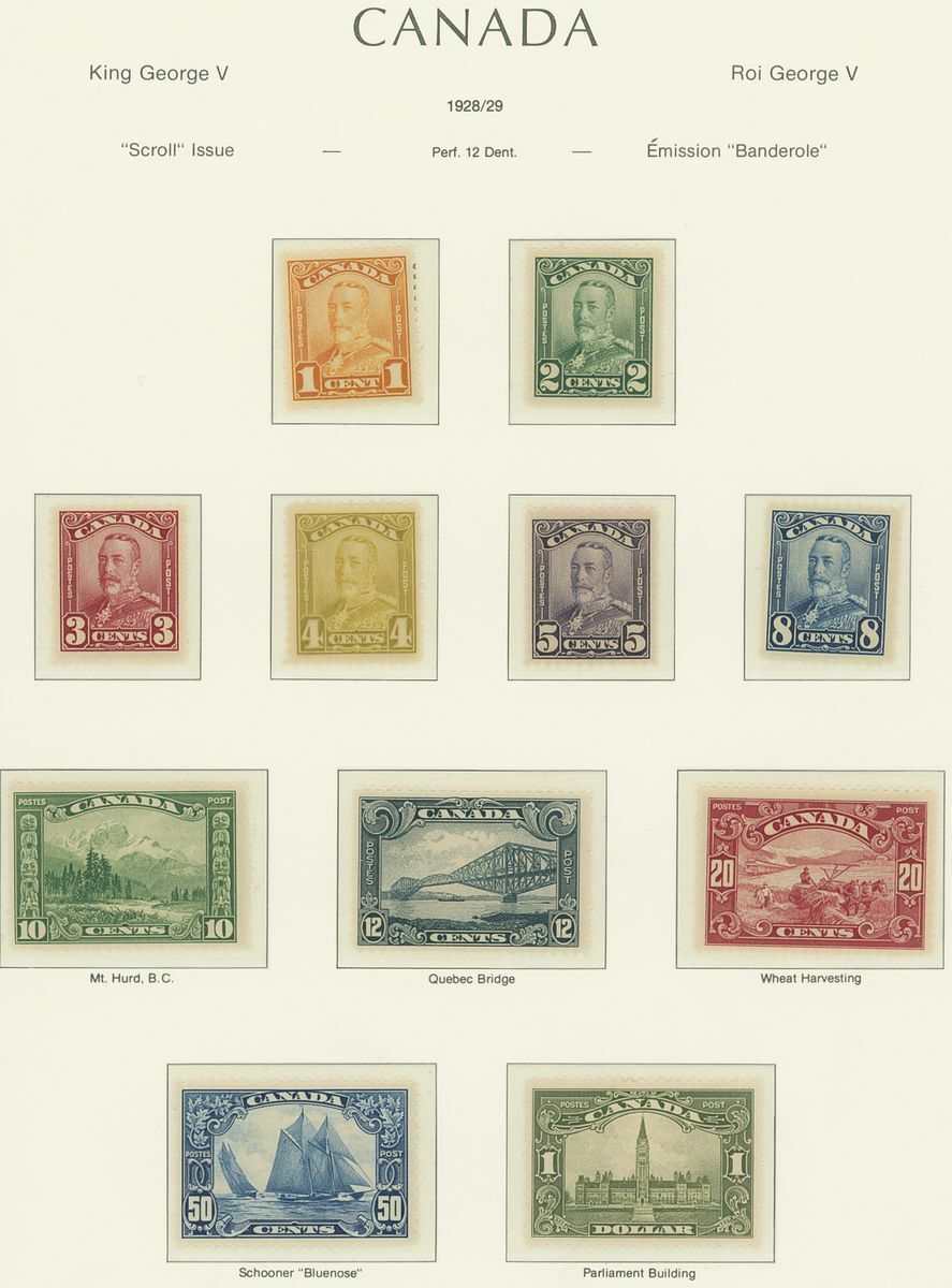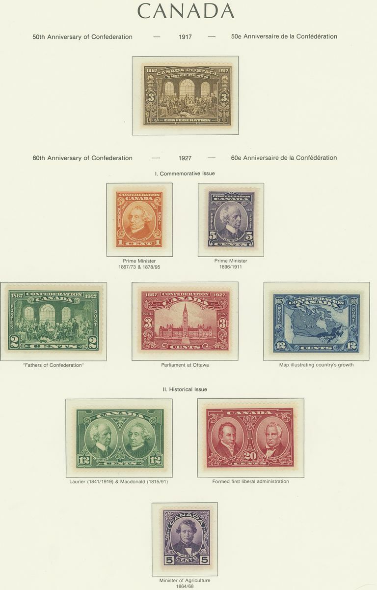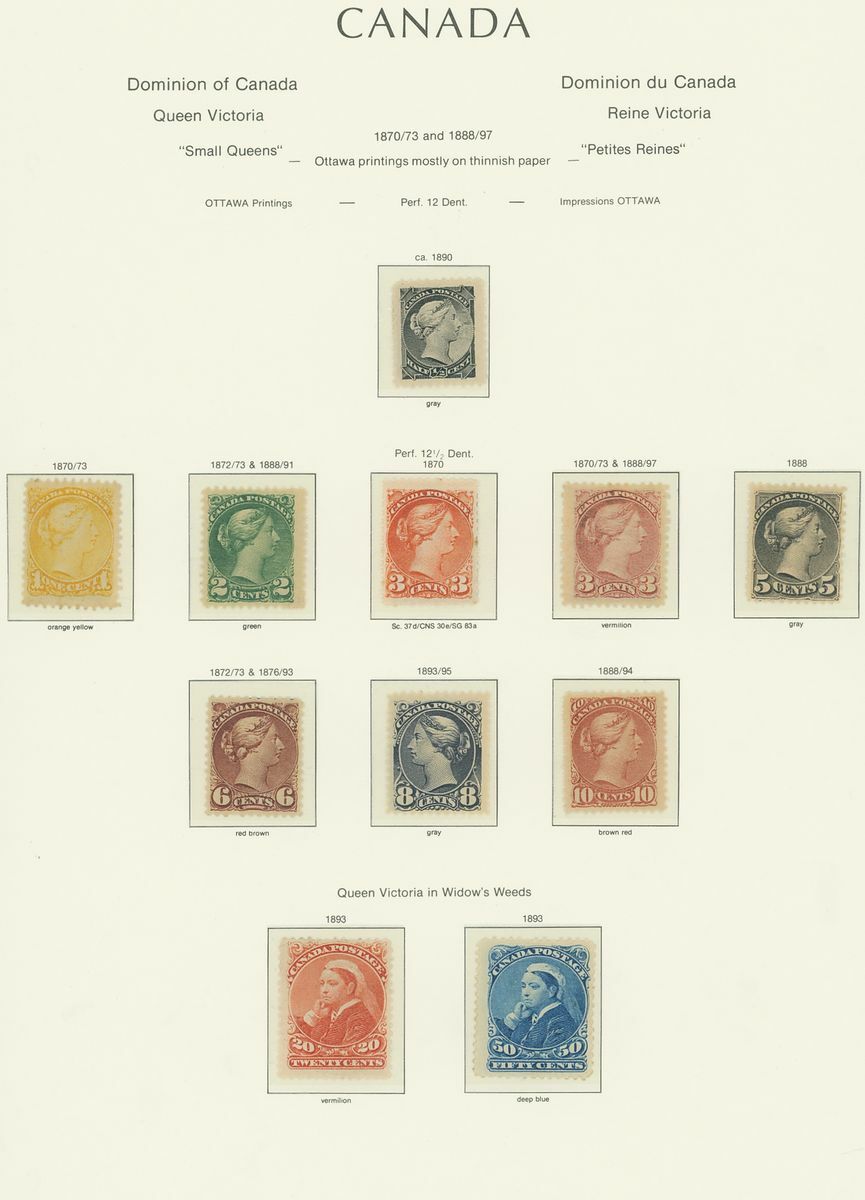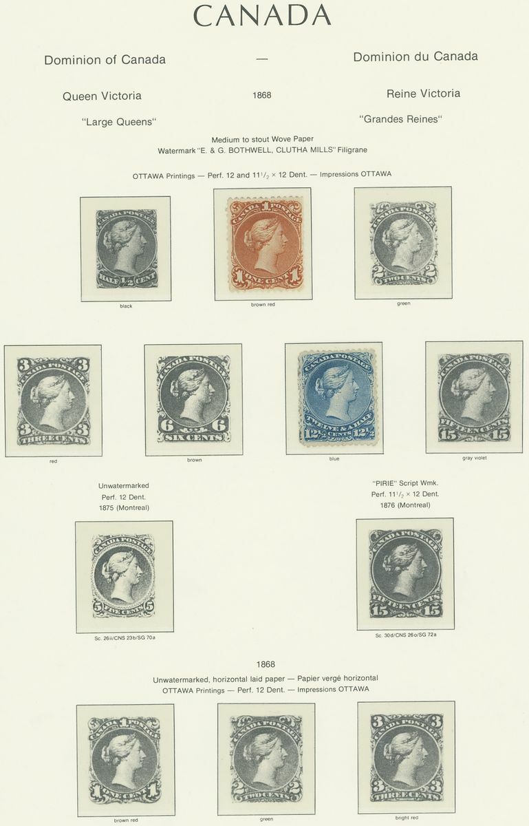1851-1952 mint collection, attractively arranged in a Lighthouse hingeless album, with many desirable and high-cataloguing items, beginning with 1852 3d red (into design at top, small thin), 1857 ½d rose (small scuff at foot, margins full to just clear), 1859 5c vermilion, nicely centered 1c rose, and 10c red lilac, strong run of Large Queens, with each denomination represented, the 15c in multiple shades, one 1c value showing portion of Bothwell watermark (reperforated), near-complete Small Queens for the available spaces, noting many shades, as well as jumbo-margin ½c, fine 5c olive and pleasing 10c dull rose-lilac and brown-red, 1c perf 11.5x12 (hinge thin), 1897 Diamond Jubilee complete, the dollar values chiefly with desirable and select centering, 1897/1902 Maple Leaf and Numeral Issues complete, the 7c to 10c Numerals particularly well centered, King Edward VII & Quebec Tercentenary complete, noting rich fresh colours, complete basic run of Admirals including coil singles, 1917 Confederation through 1951 coils complete, chiefly fine-very fine, with a spot-check yielding several never hinged examples, including the 50c Grand Pré and $1 Mount Edith Cavell, fulsome back-of-the-book including complete airmails, 2c to 8c registration stamps including shades, Admiral War Tax complete including the scarce 2c+1c brown Die I, fresh Special Delivery issues including a very fine 1898 10c, complete official overprints, most with select centering, chiefly no gum to the end of the Large Queens, then largely hinged from thereon, the odd fault to be expected particularly among the Victorian issues, a few certificates accompany, a chiefly fresh and fine collection which took tremendous effort to assemble.