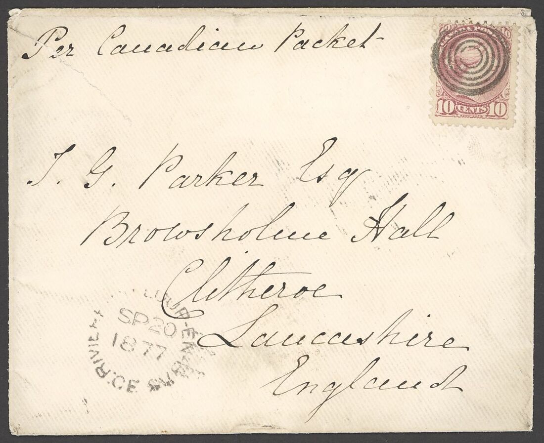 1870-90 Small Queen 10c. deep lilac-rose centrally cancelled on 1877 (20 Sept.) envelope from Riviere du Loup En Bas to England, marked "Per Canadian Packet", showing despatch c.d.s. at lower left with arrival d.s. on reverse; envelope with tear at upper left. Greene Foundation Certificate (2007). S.G. 87