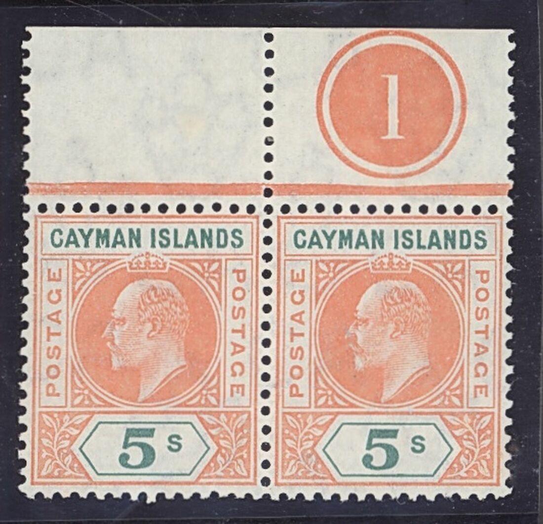1907 MCA 5/- salmon and green, a horizontal pair from the top of the sheet with plate number '1'; fine and very lightly mounted mint. S.G. 16, £400+