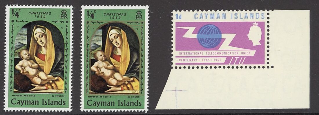 1965 ITU 1d. lower right corner example with variety blue doubly printed, and 1969 ¼c. emerald variety gold frame omitted with normal for comparison, usual slightly patchy gum otherwise fine, S.G. 184var, 255a