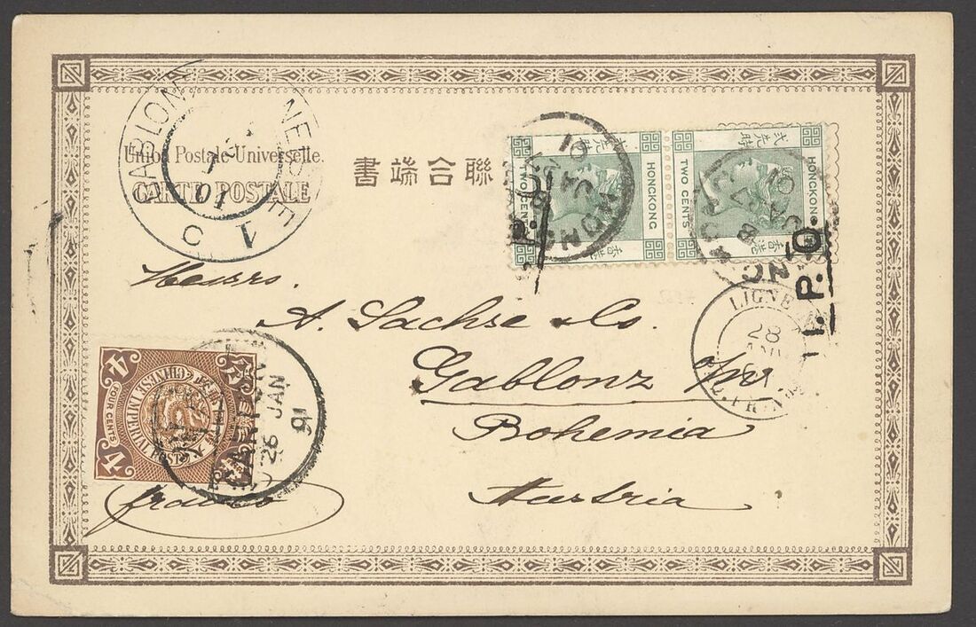Canton: 1901 (26 Jan.) postcard to Austria bearing, C.I.P. 4c. brown cancelled by bilingual Canton c.d.s., Hong Kong 2c. green pair with Canton type 1 I.P.O. tieprint and Hong Kong c.d.s. (27.1), alongside French steamer "Ligne N" (28.5) and arrival Gablonz d.s., few usual imperfections including lower right corner of the card creased, scarce and attractive .
