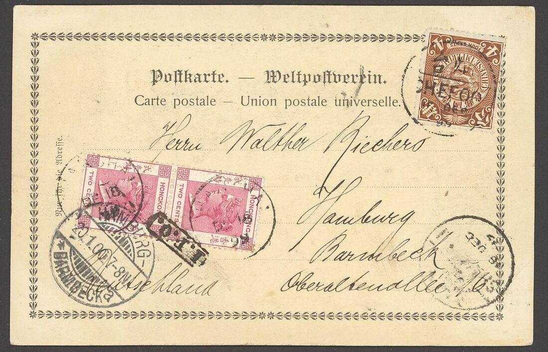 Chefoo: 1899(16 Dec.) postcard to Germany bearing, C.I.P. 4c. brown cancelled by bilingual Chefoo c.d.s., Hong Kong 2c. carmine pair with Chefoo I.P.O. tieprint and Shanghai c.d.s. (18.12), alongside Shanghai bilingual c.d.s (12.12) and arrival Hamburg (20.1.1900) c. d.s., few usual imperfections nevertheless scarce and attractive .