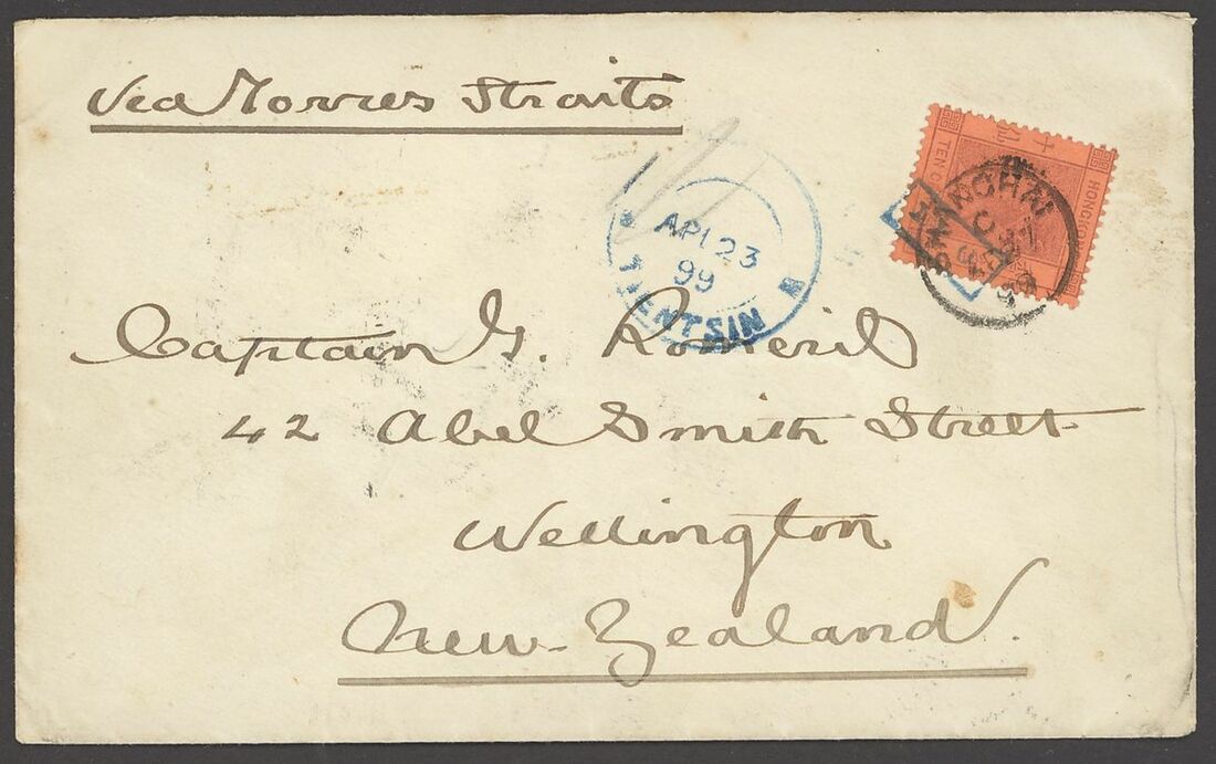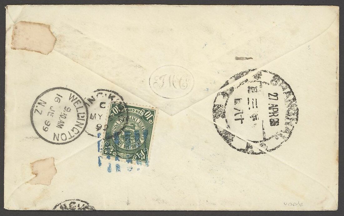 Tientsin: 1899 (23 April) envelope to New Zealand bearing, on the reverse, C.I.P. 10c. green cancelled by blue pa-kua, the front with a good strike of Tientsin c.d.s. in blue, Hong Kong 10c. purple on red with Tientsin I.P.O. tieprint in blue and Shanghai c.d.s. (27.4), the reverse also bears Shanghai Dollar Chop (27.4), Hong Kong transit (5.5) and Wellington arrival (16.6). A few usual imperfections, nevertheless a scarce destination .