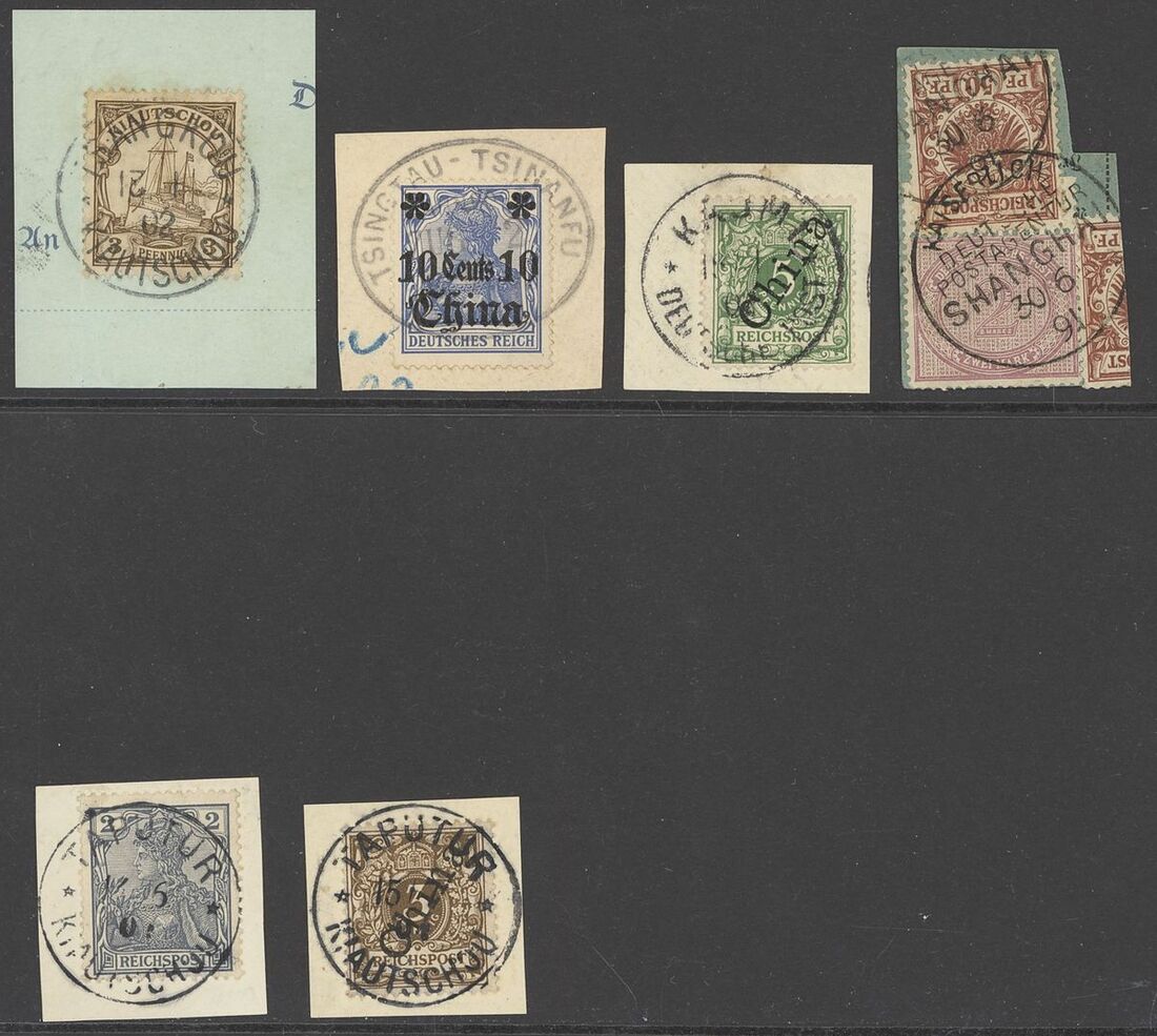 1891-1910 selection including on pieces (6) with clear c.d.s. comprising 1891 forerunner 2m. an 50pf. on piece, 1901 Reich 2pf . tied by Taputur c.d.s., also 1898 10pf  Nur für Marine-Schiffsposten postal stationery cancelled by "Tsintanfort" c.d.s.; 1910 China C.I.P. 1c. green postal stationery in combination with Kiautschou 2c.,  mixed condition.