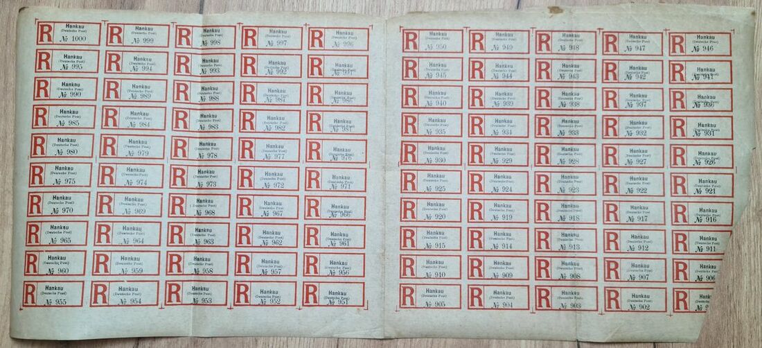 "Hankau" registration labels on gummed paper, large piece showing in the middle the ten horizontal pair with gutter including at left a full pane of fifty with labels numbered (1000-951,) and at right almost complete pane (950-901) with three labels partial missing, some faults including creasing, still a very difficult and attractive item .