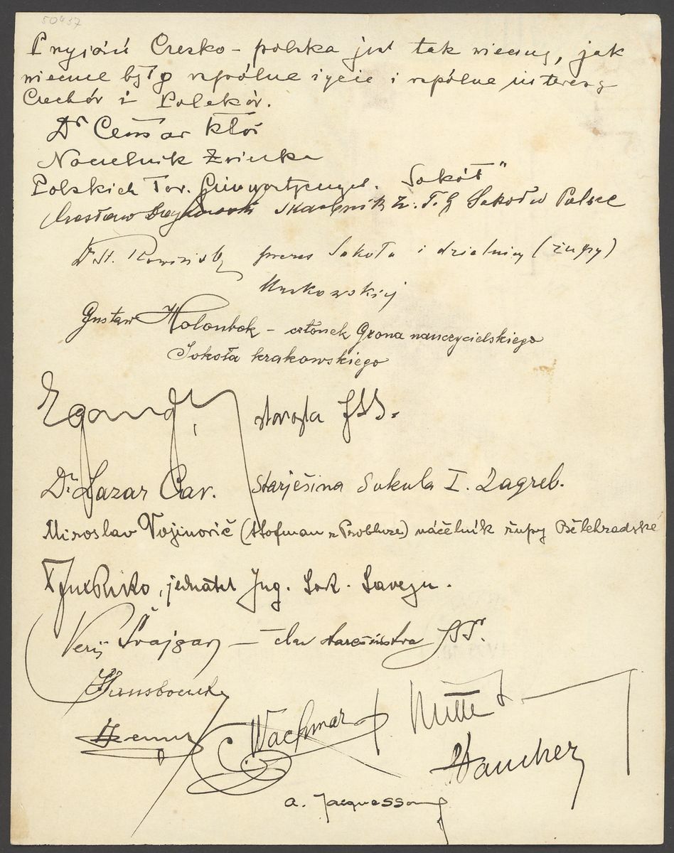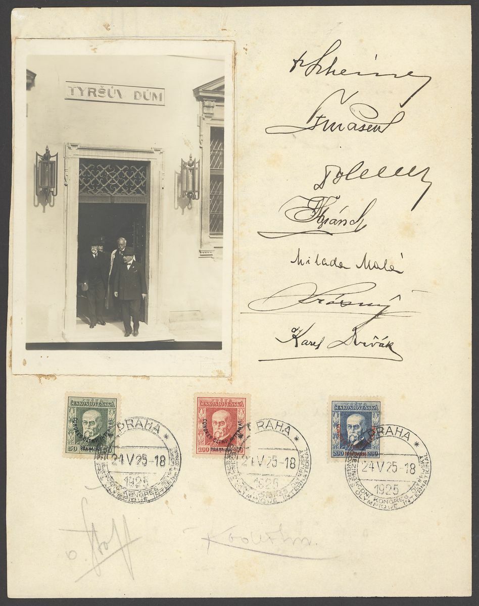 1925 (24 May) Congres Olimpique International 1925 set of three on a page cancelled to order by Prague special c.d.s., alongside a picture from the congress and signatures of the participants, the reverse with other signatures, some toning nevertheless a rare historical document .