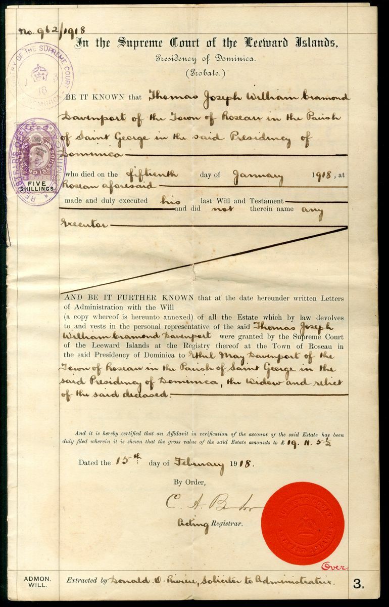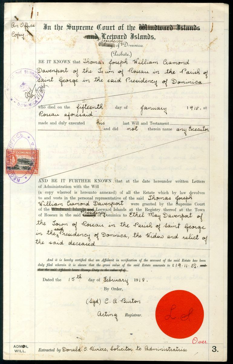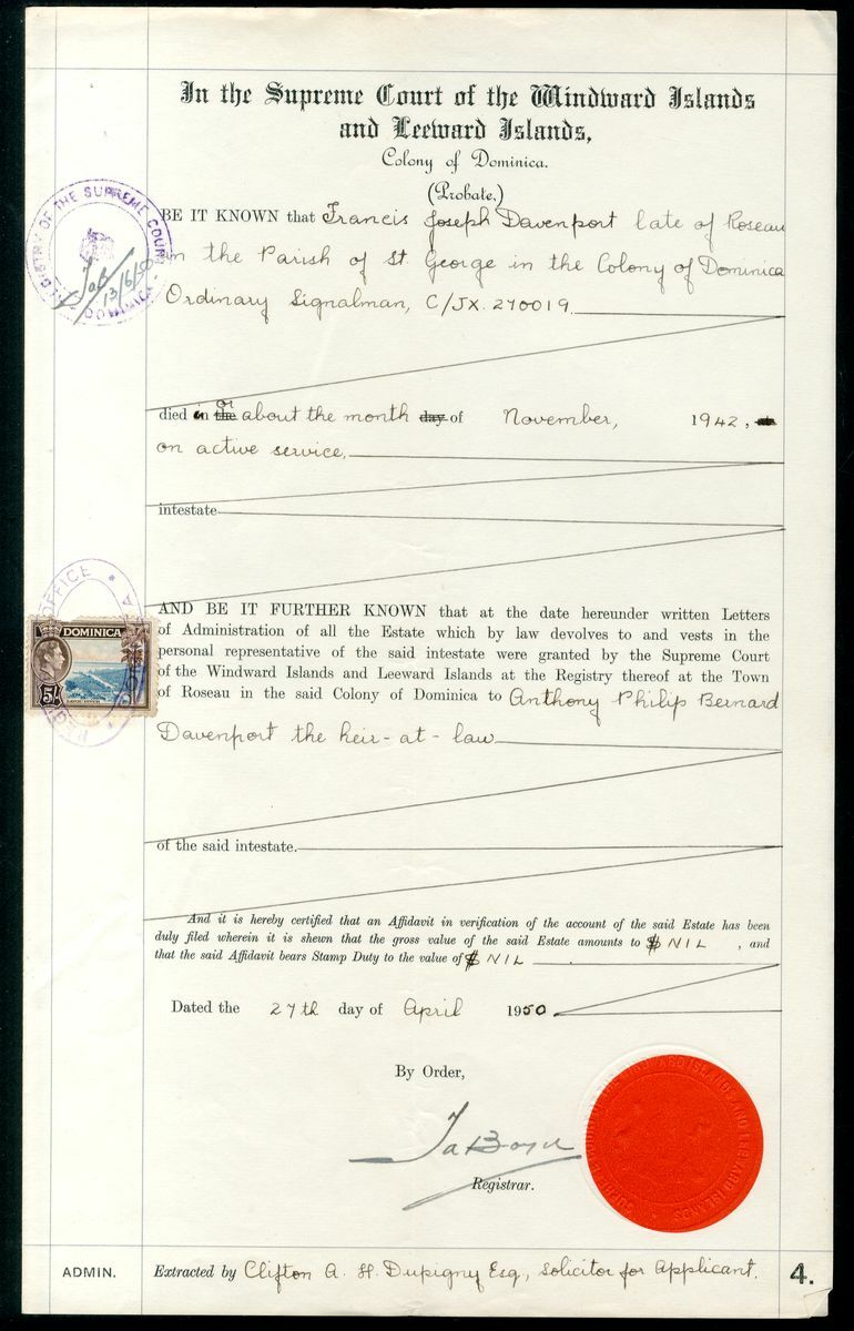 1918-42, six documents, mostly relating to the Davenport family, including Probate Engrossement bearing Leeward Islands Fiscal Edward 5/- (2), another bearing Domnica Postage George VI 2/-, 2/6d., the remaining for each bearing Dominica Postage 5/-; good to fine