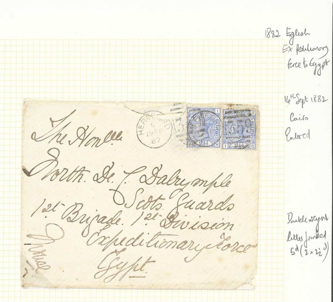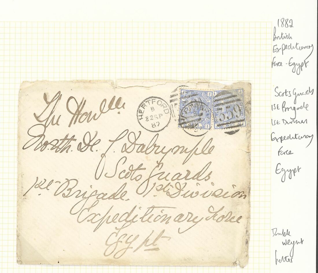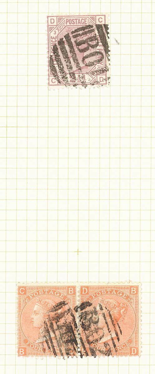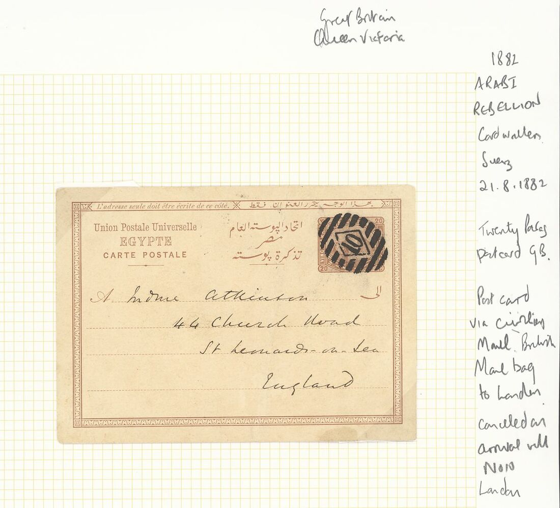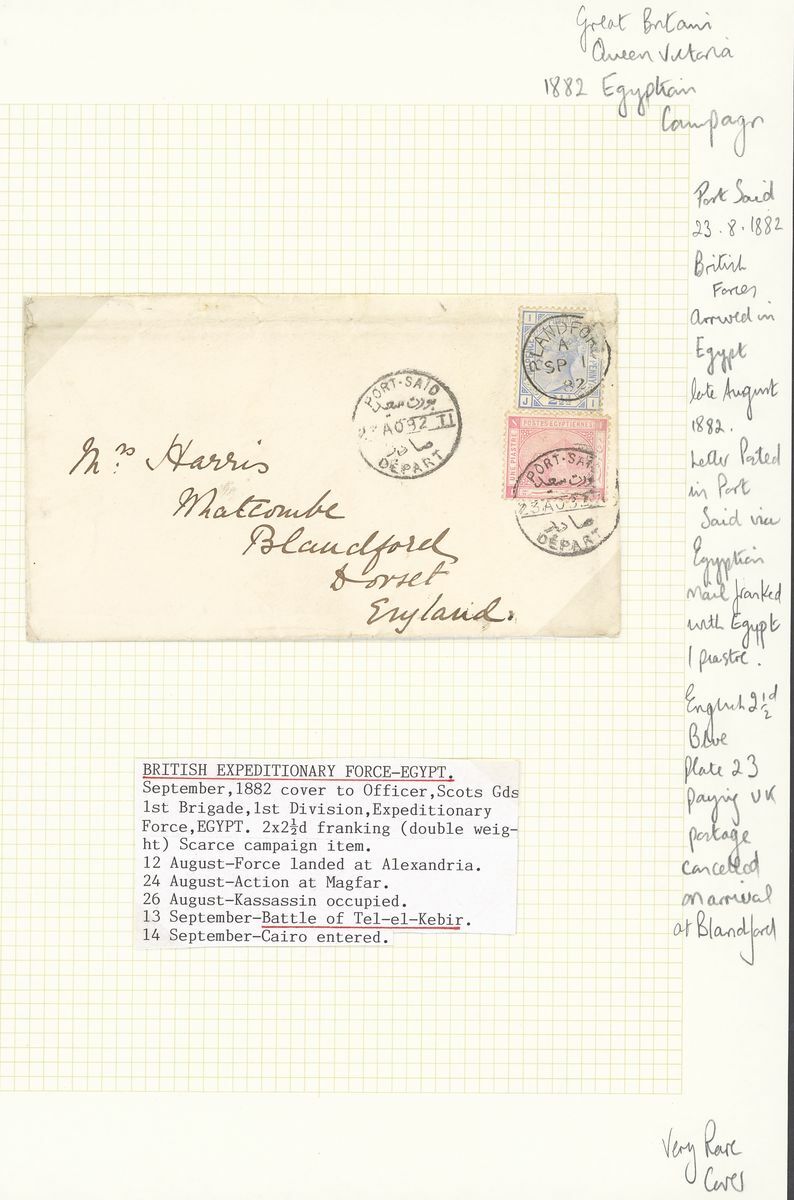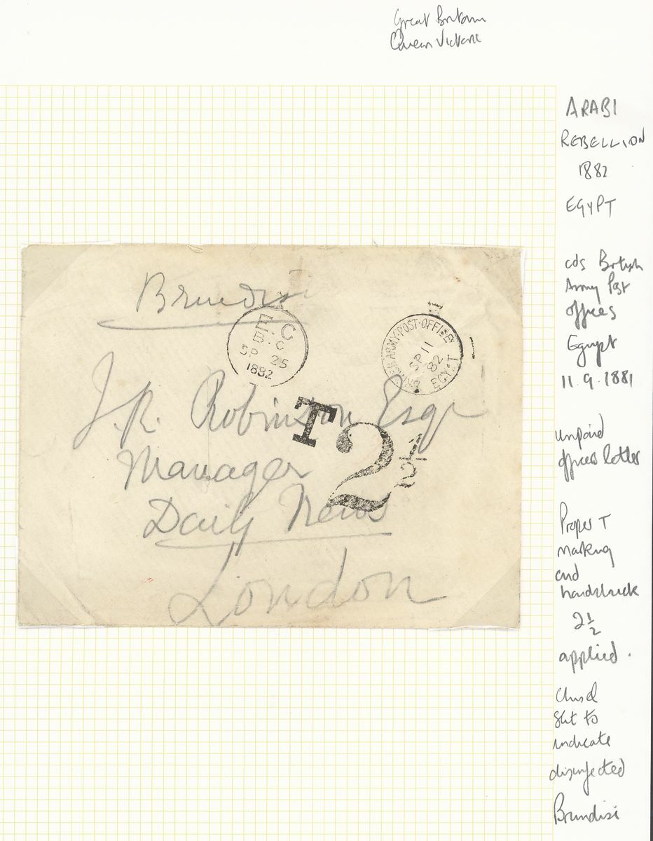 Stamps and postal history selection arranged on written up album pages including Great Britain 2½d. pl. 3 rosy mauve cancelled "B01", 4d. vermilion pl. 14 horizontal pair cancelled "B02"; The 1882 Arabi Rebellion: 2½d. blue (2) used with complete or part strikes of the "