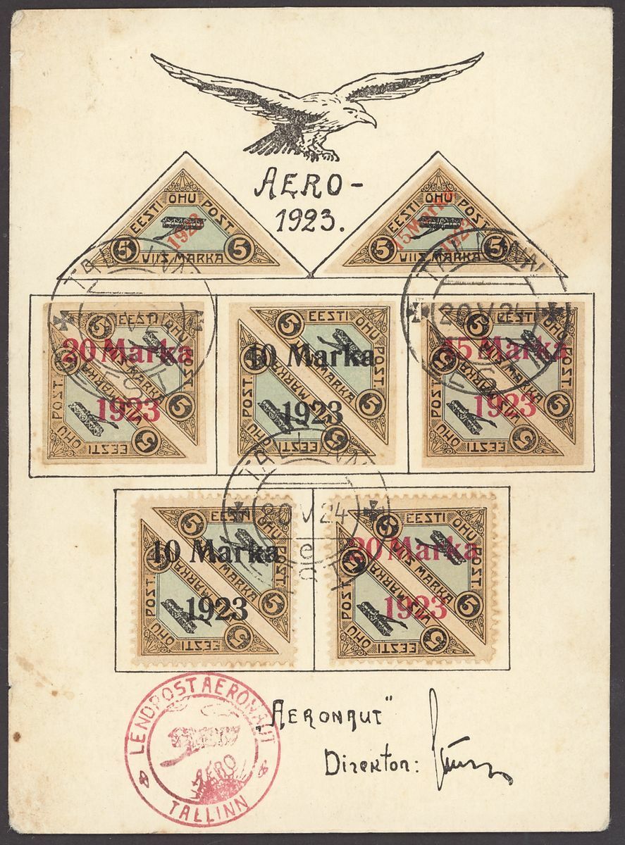 1923 (Oct.) Air 5m. and 15m. on 5m., 1923 (Oct.-Nov.) imperforate 10m. on 5m., 20m. on 5m., 45m. on 5m., perf. 11½ 10m. on 5m., 20m. on 5m. (second printing), tied to piece by