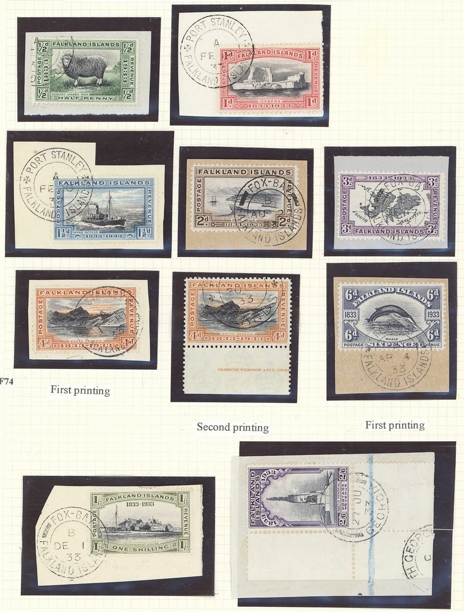 1933 Centenary ½d. to 2/6d., mostly used on individual pieces, variously cancelled, the 2d., 3d., 6d. and 1/- at Fox Bay, the 2/6d. (from the lower left corner of the sheet) at South Georgia, also 4d. (off piece) with part imprint; fine. S.G.127-135
