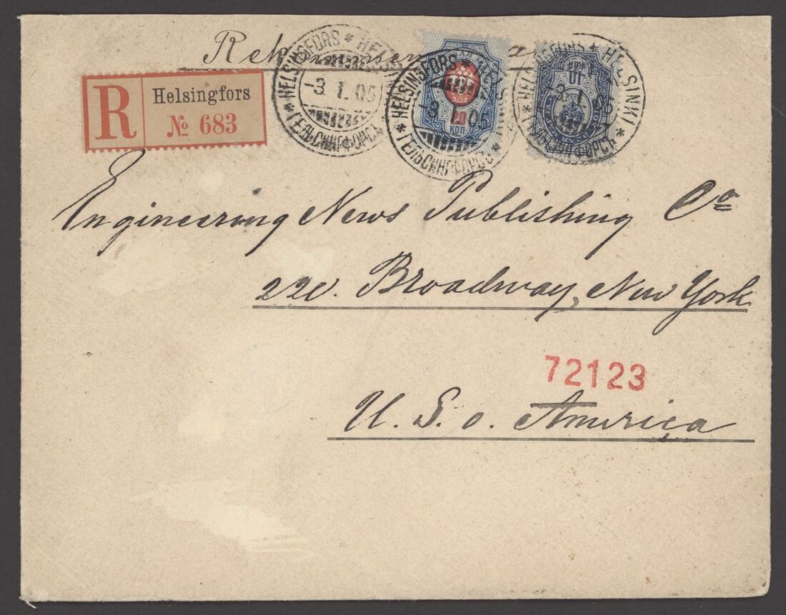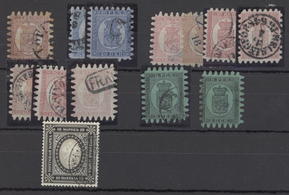 1866-1905 used selection (16) including 1866 vertically laid paper 5p., wove paper 20p. (2), 40p. (6), 1866-67 8p. (2), 1901-15 plain paper 10m. and 1905 front registered from Helsinki to New York bearing Russia 10k. and 20k., chiefly fine used with most of the rouletted issues having full teeth