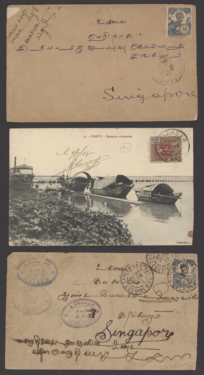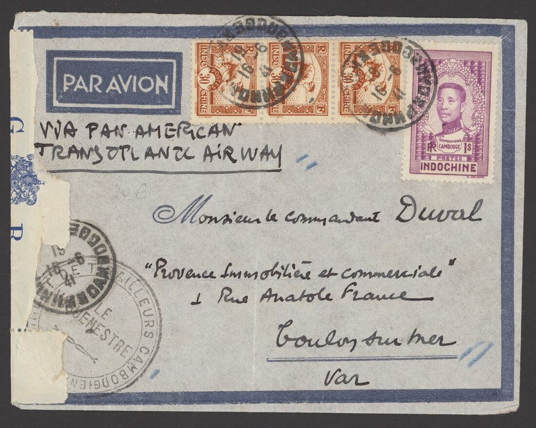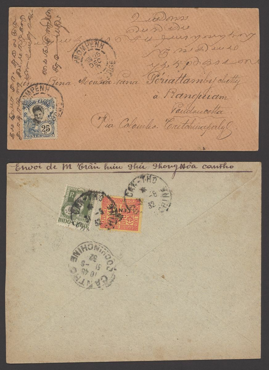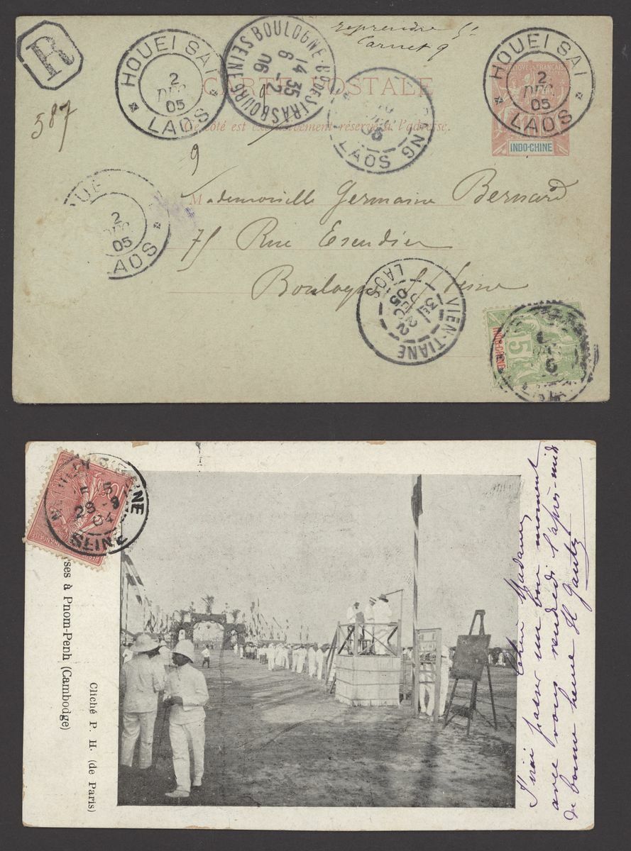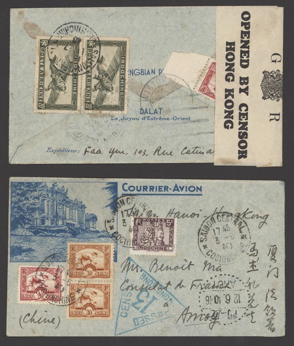 Selection of 50 items, including 1905 10c. picture postcard additionally franked 5c. with Houei Sai/Laos cancellation, 1910 envelope franked Indian Woman 25c. with PnomPenh cancellation, 1940 pictorial Air Mail envelope to Amoy with Hong Kong Censor strip, 1941 Air Mail envelope to France franked 30c. (3), $1 with Phnom Penh cancellations and Hong Kong Censor strip, a good variety of frankings and cancellations; mixed condition