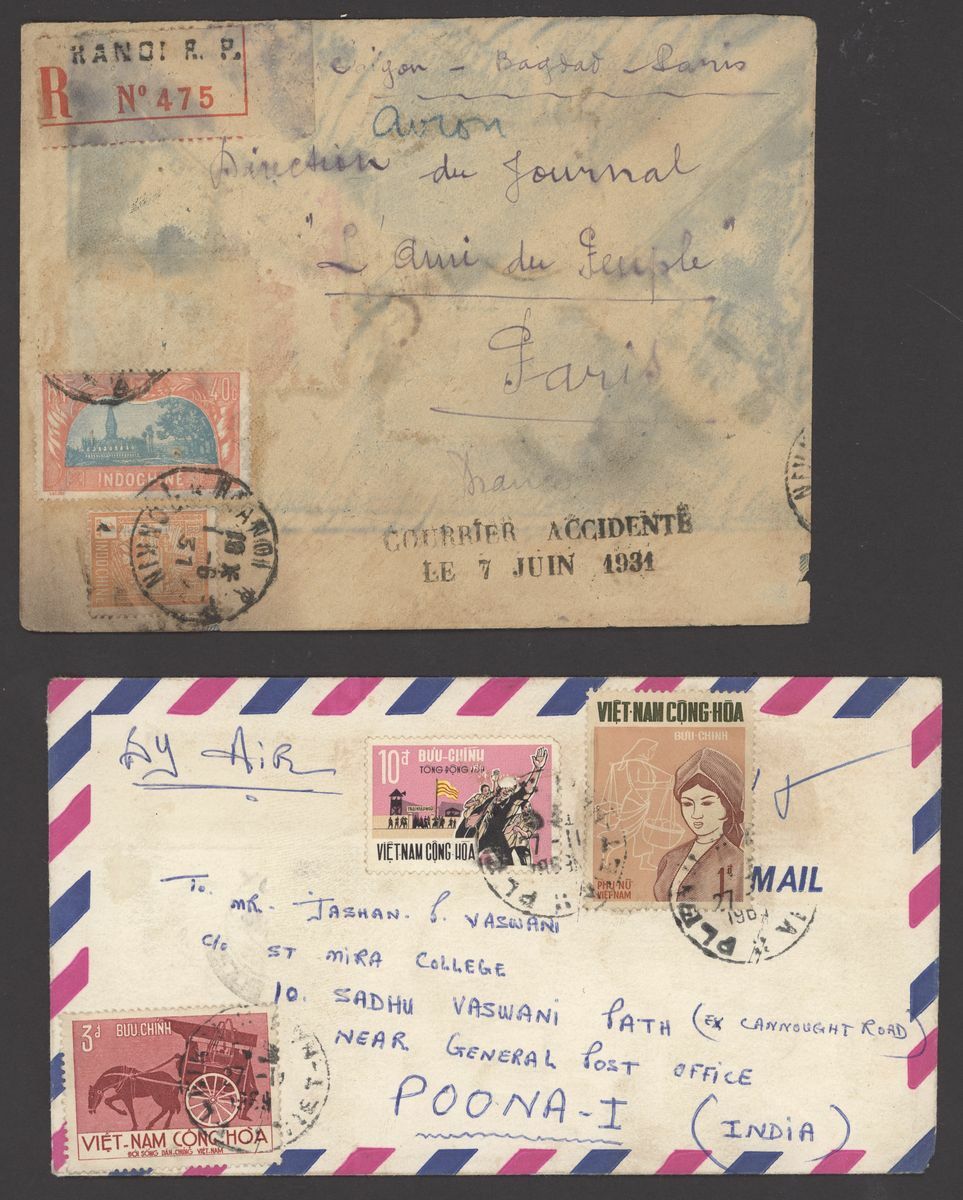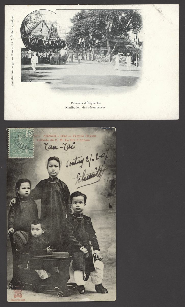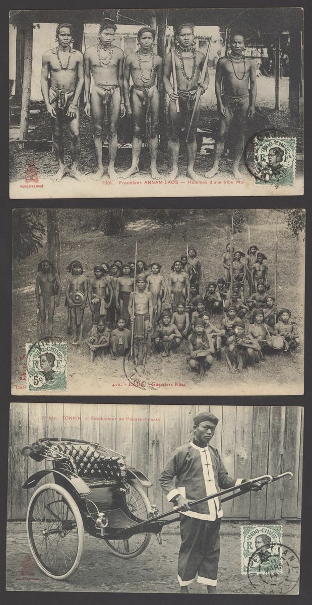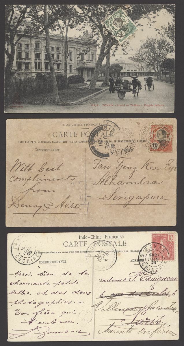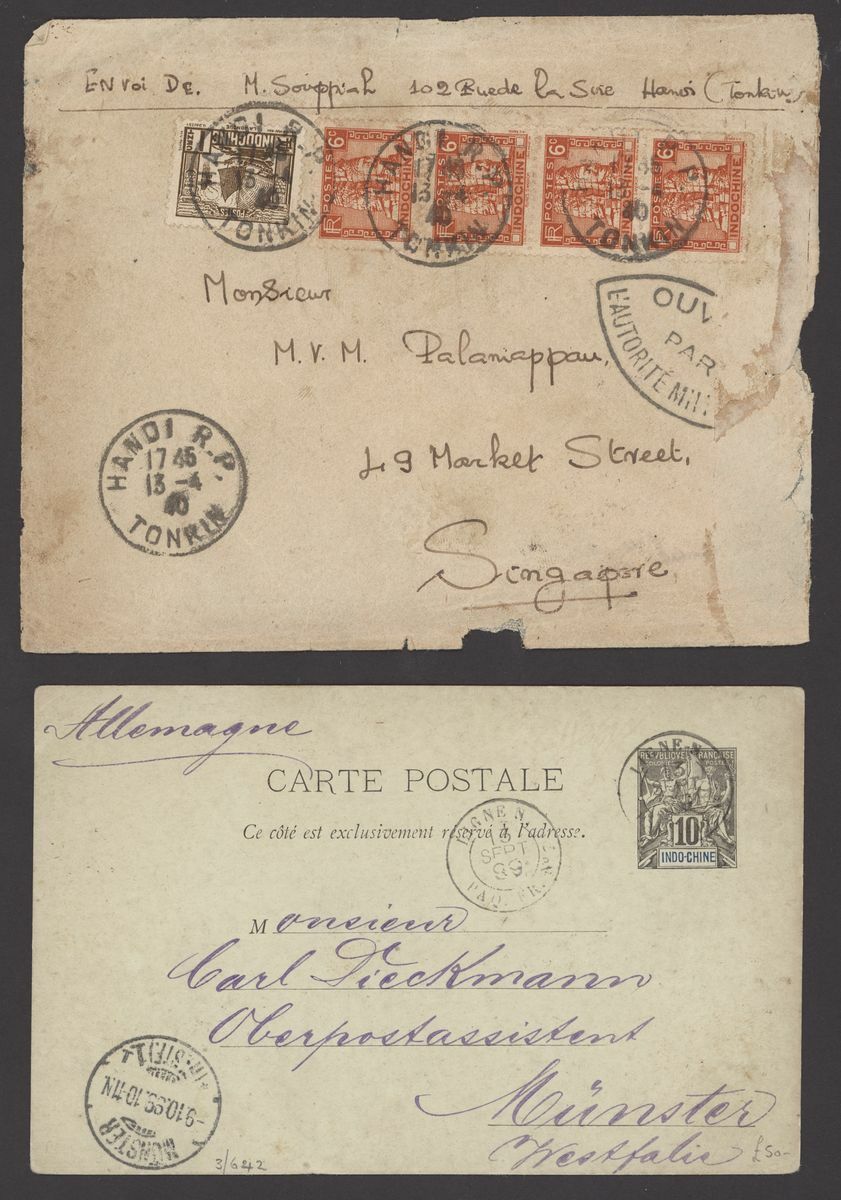 Selection of 50 items, including 1905 10c. picture postcard additionally franked 5c. with Houei Sai/Laos cancellation, 1910 envelope franked Indian Woman 25c. with PnomPenh cancellation, 1940 pictorial Air Mail envelope to Amoy with Hong Kong Censor strip, 1941 Air Mail envelope to France franked 30c. (3), $1 with Phnom Penh cancellations and Hong Kong Censor strip, a good variety of frankings and cancellations; mixed condition