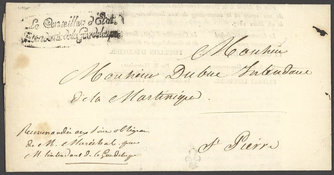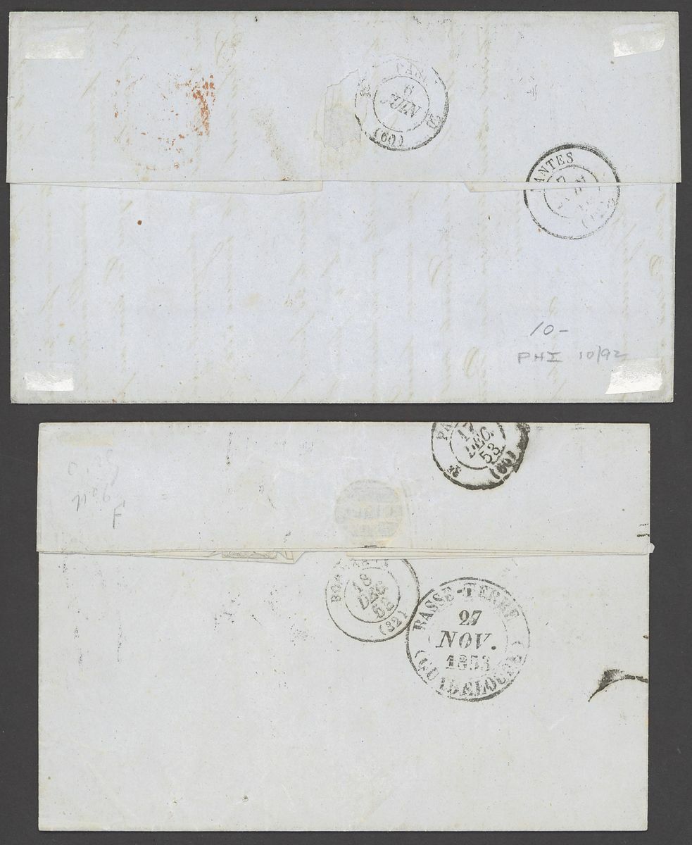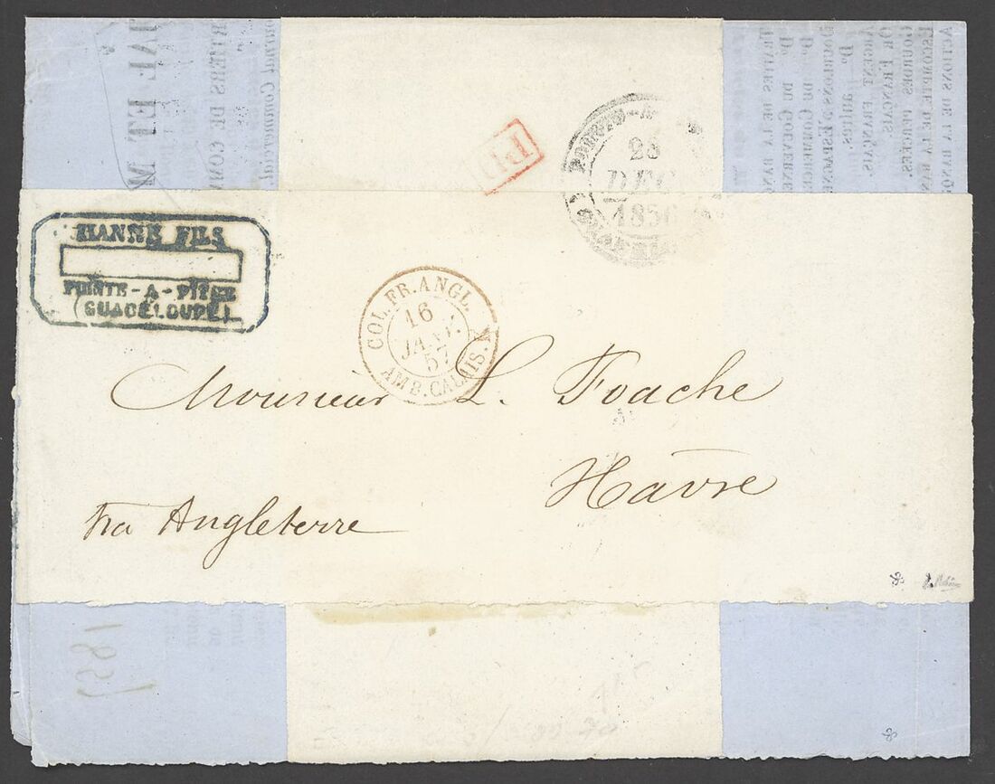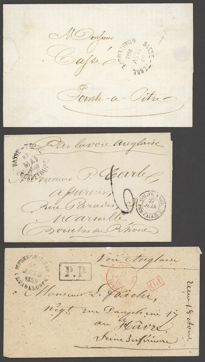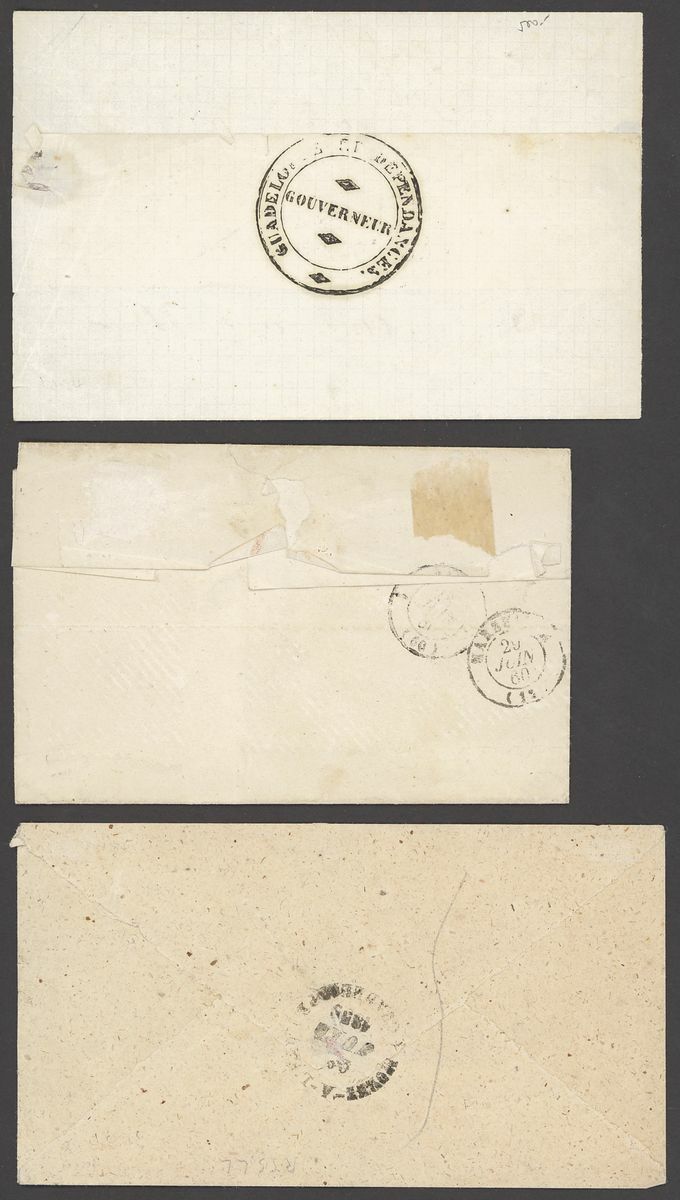 1817-1863 stampless postal history selection (7) including 1817 (28 March) Official Printed Decree from Basse Terre to St. Pierre (Martinique) with Official cachet on the front; 1856 (28 Dec.) bulletin to Le Havre (one of the finest of the few examples of stampless printed matter mail known folded), with Pointe a Pitre datestamp, red framed