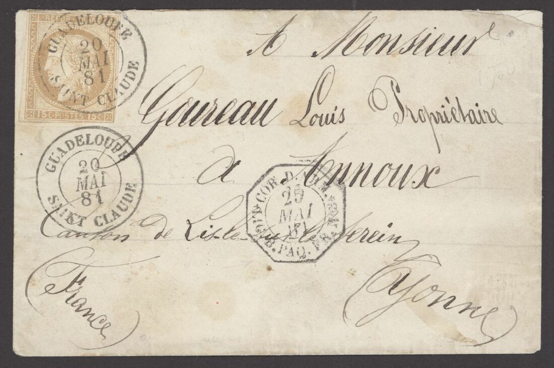 1881 (20 May) envelope to Yonne bearing General Issues 1871-76 thick figures 15c. (touched at places) tied by Guadeloupe/Saint Claude datestamp with octagonal Corr. D. Armees/Lig. B. Paq. Fr. below, on reverse Military endorsement and octagonal Corr. D'Armees/Basse Terre datestamp; some staining, otherwise very fine and an extremely rare and highly unusual Military from this village being denoted by the rare transit markings. Illustrated in the Yvert catalogue 2017 (page 112), with a catalogue value of €1,400.